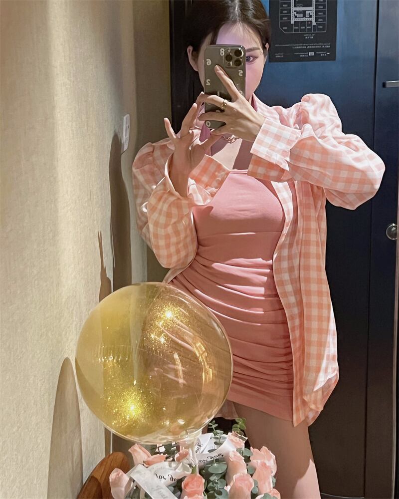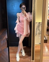 色:ピンクのホルターネックドレス,格子縞のシャツワンピース