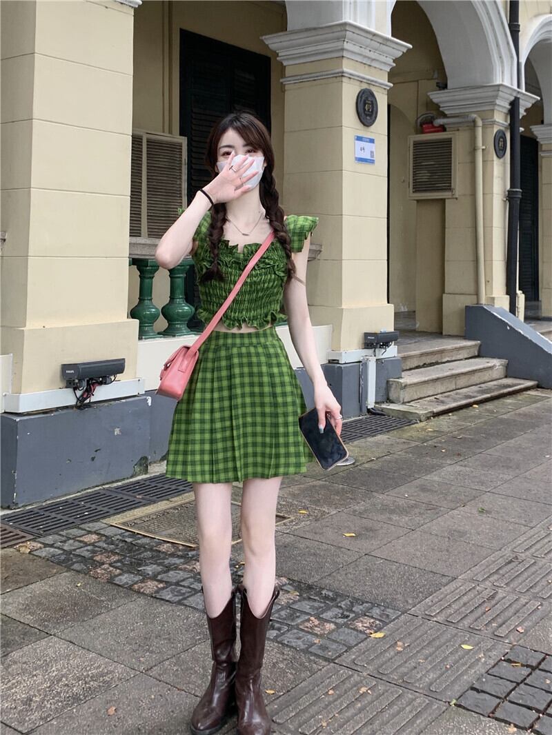 グリーン格子柄スカート サマースリーブトップス プリーツ 夏物 10/5 秋冬 オータム ウインター ナチュラル mi4652422043859