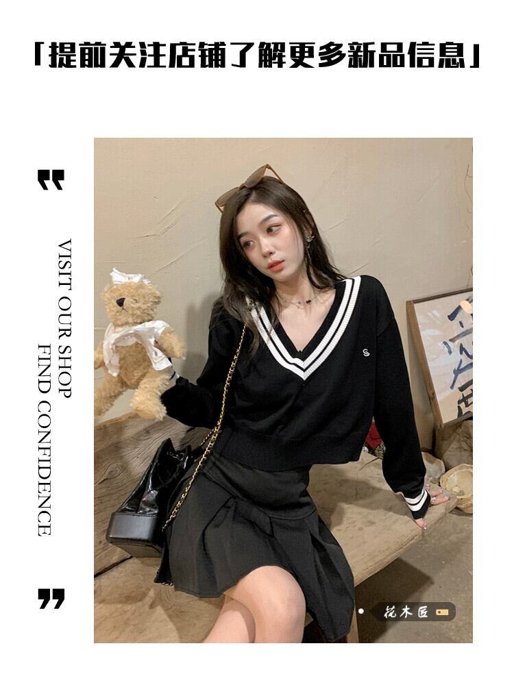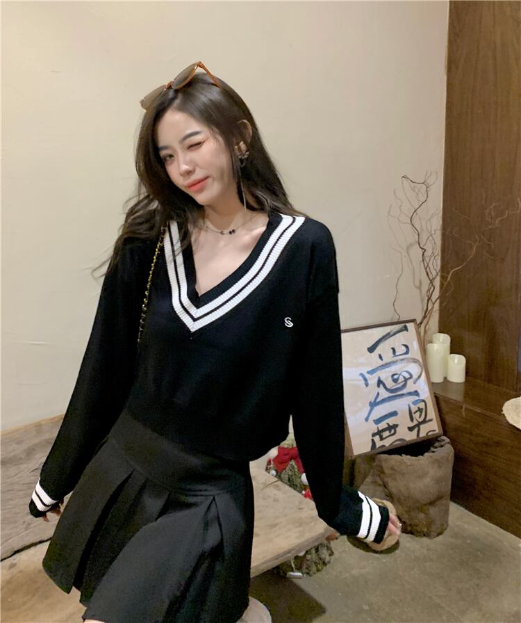 スタンダードスタイルカラーVネックセーター オータムルーズショートトップス レトロ 秋物 10/5 秋冬 オータム ウインター ナチュラル mi4624736880241