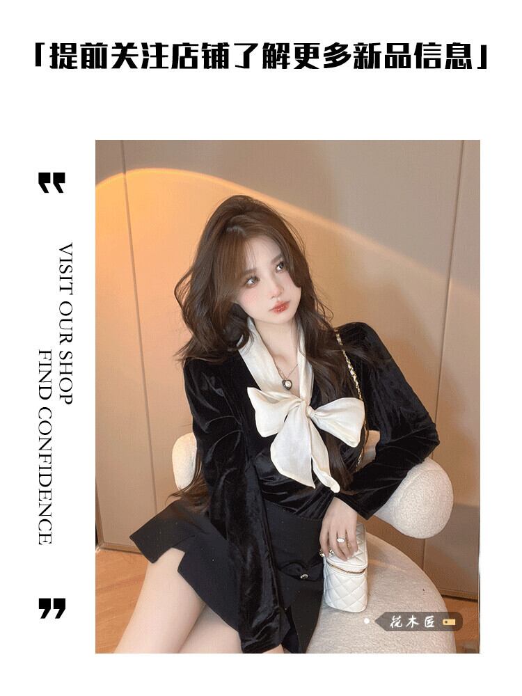 スタンダードゴールドベルベットVネックシャツ オータムリボントップス ロング レトロ 秋物 10/5 秋冬 オータム ウインター ナチュラル mi463037158945