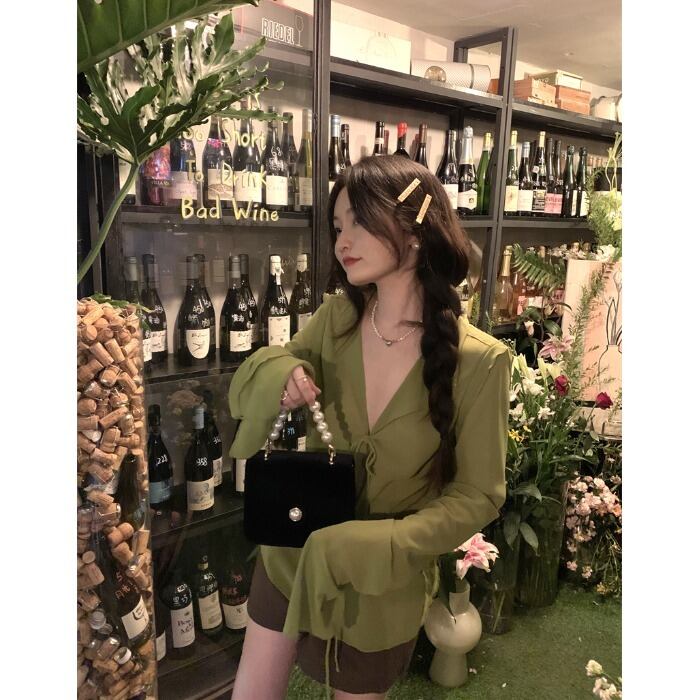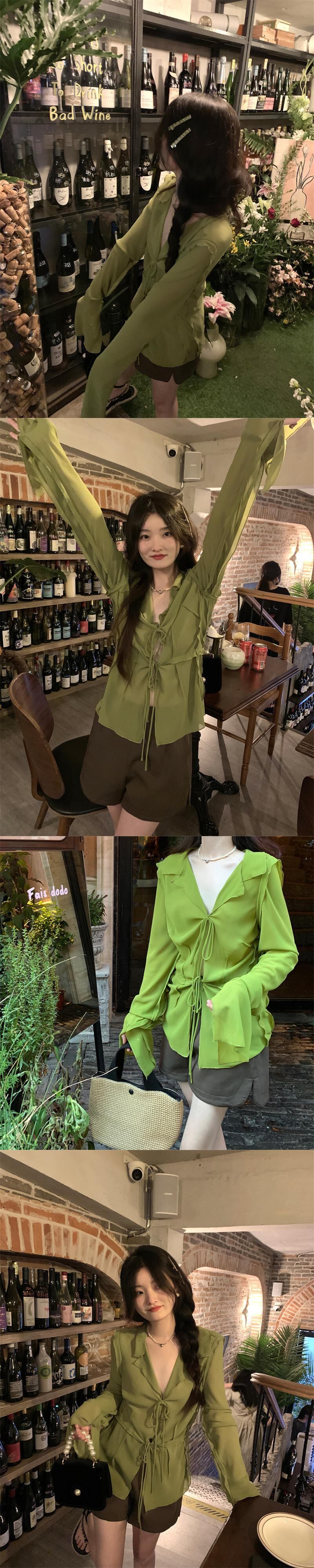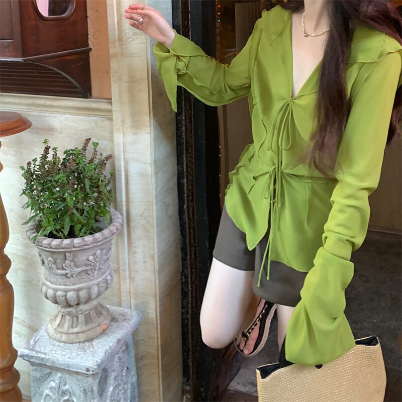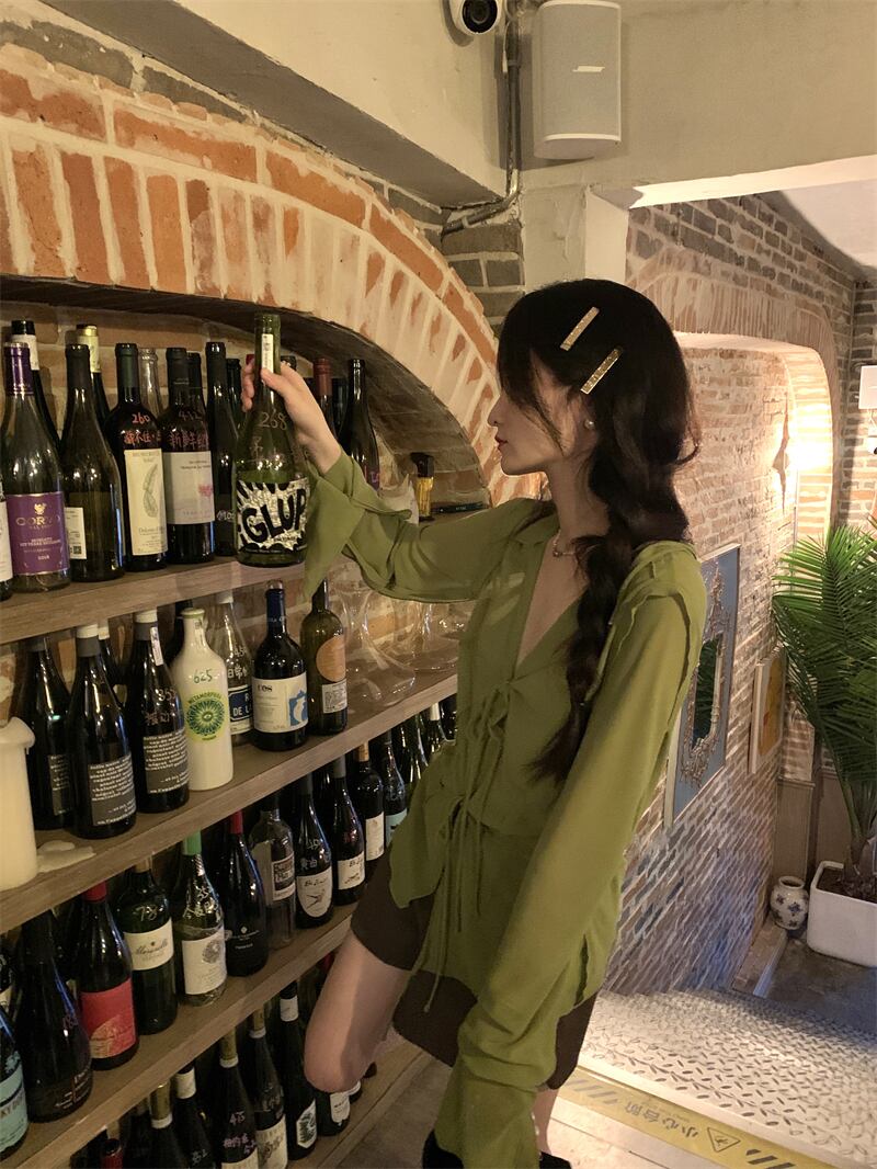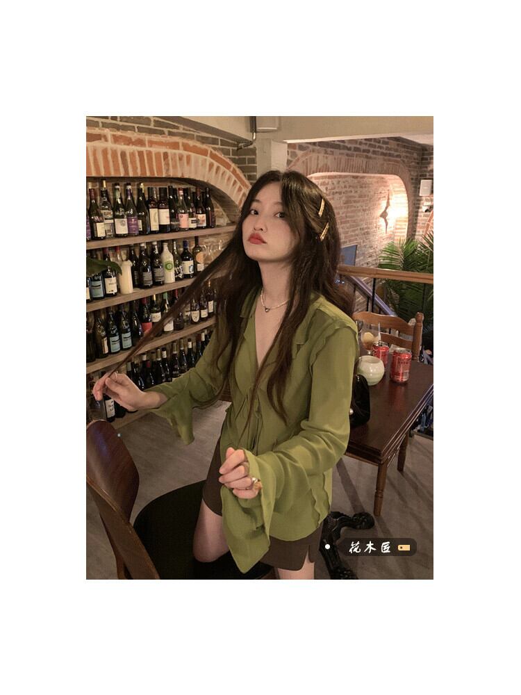 Vネックグリーンシャツ ジャケット オータムカーディガントップス ロング 秋物 10/5 秋冬 オータム ウインター ナチュラル mi4667166327449