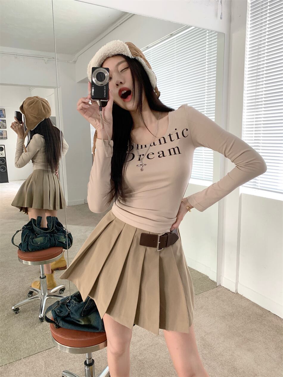 色:グレートップシングルピース,ティーアプリコットトップ,Ceeカラーのプリーツスカート