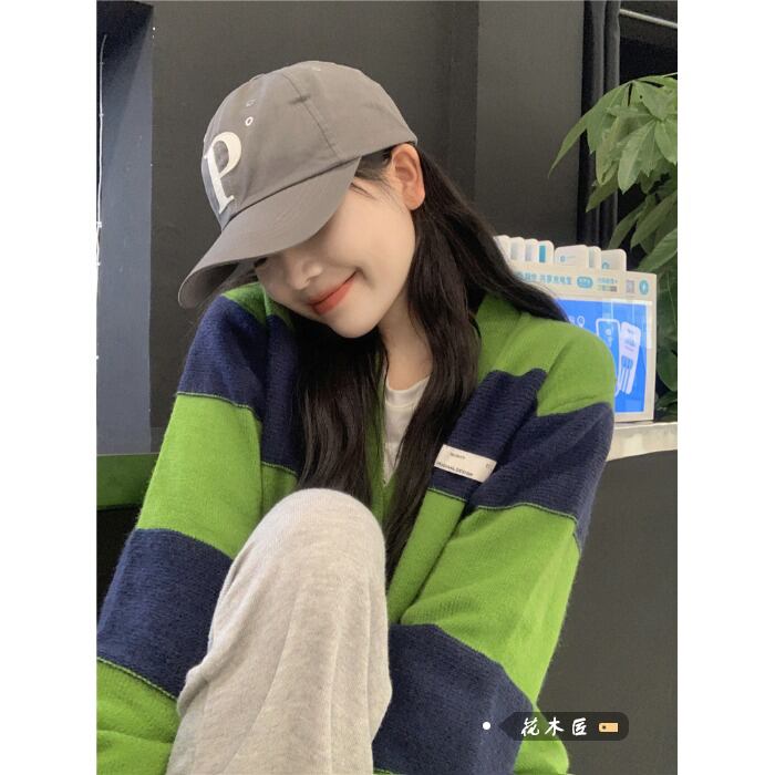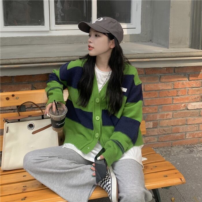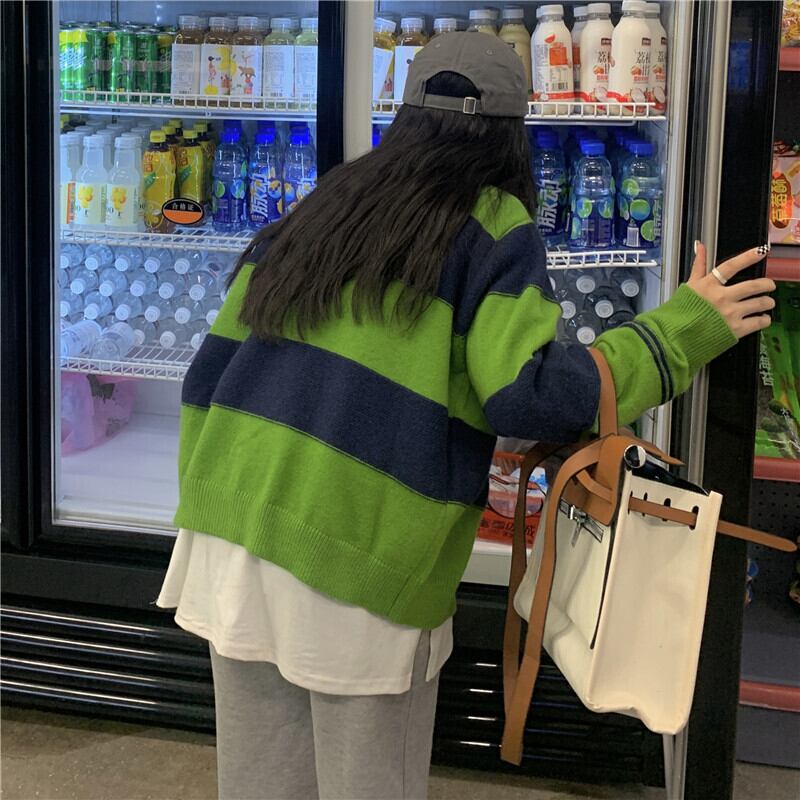 スタイルスタンダードVネックストライプセーター コート オータムルーズニットトップス レトロ 秋物 10/5 秋冬 オータム ウインター ナチュラル mi4626875419324