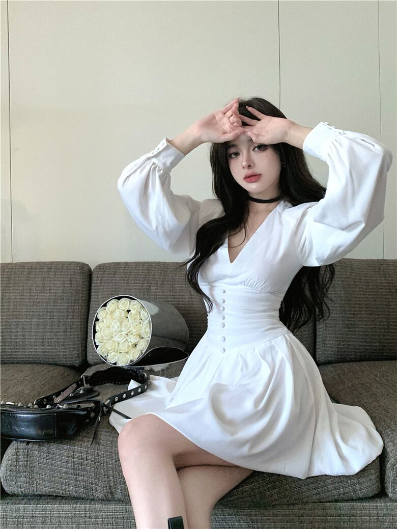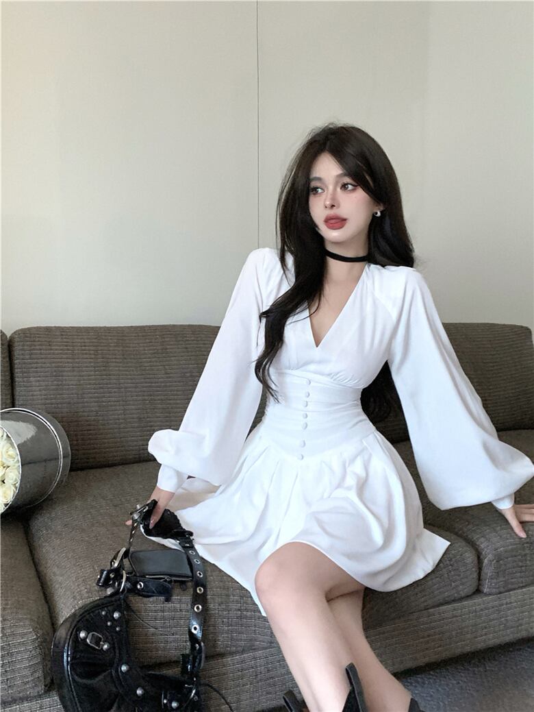 ホワイトドレス オータムVネックウェストAラインスカート 秋物 10/5 秋冬 オータム ウインター ナチュラル mi4659512926335