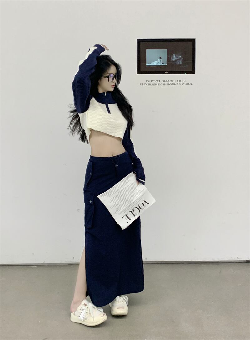 色:青と白のカラーコントラストシャツ,ワンピースロングスカート