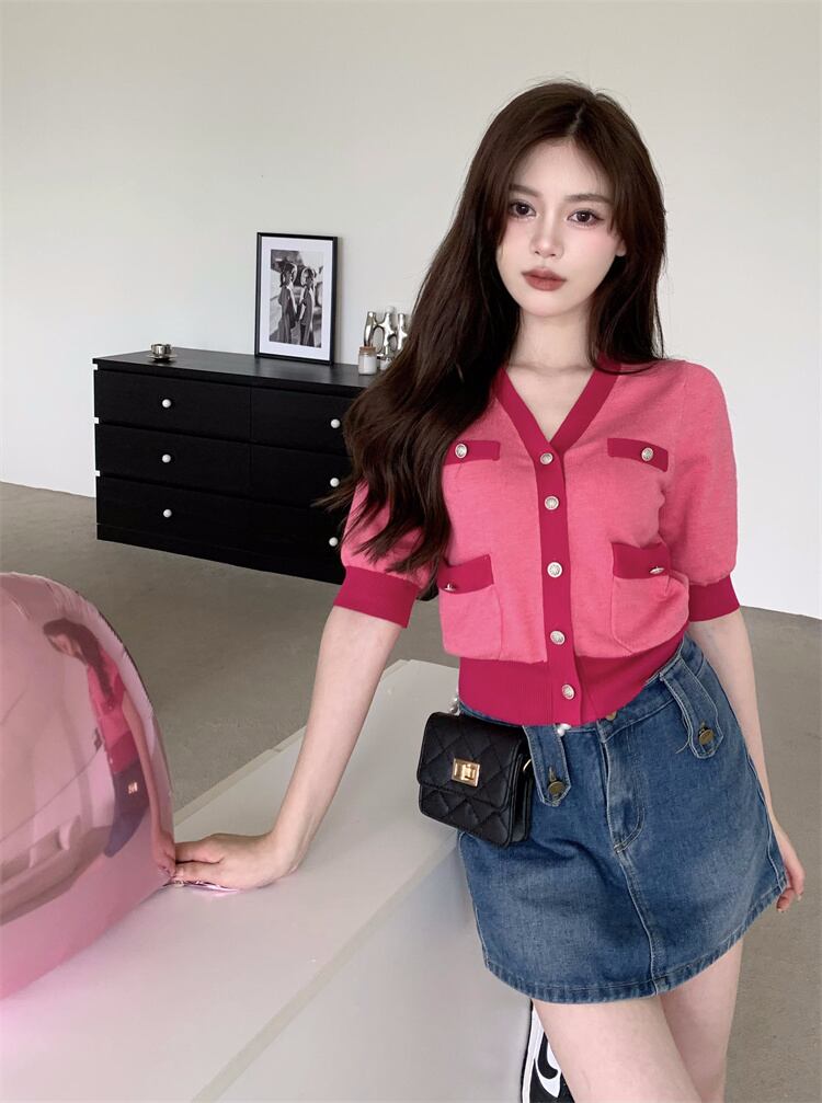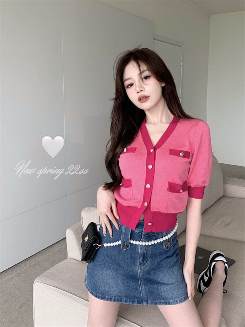Vネックセーター オータムルーズ薄手ショートカーディガントップス ピンク 秋物 10/5 秋冬 オータム ウインター ナチュラル mi4636626423993