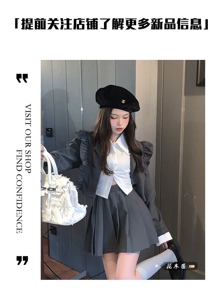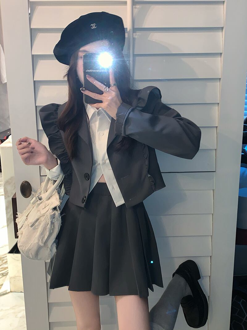 色:白いシャツのワンピース,菌灰色のスーツ,グレープリーツスカート