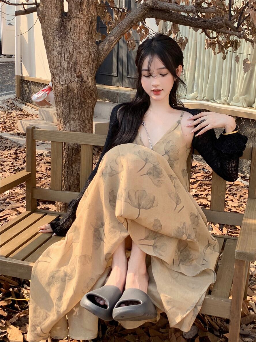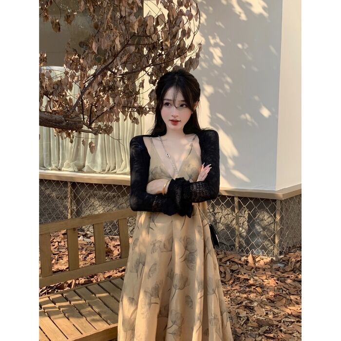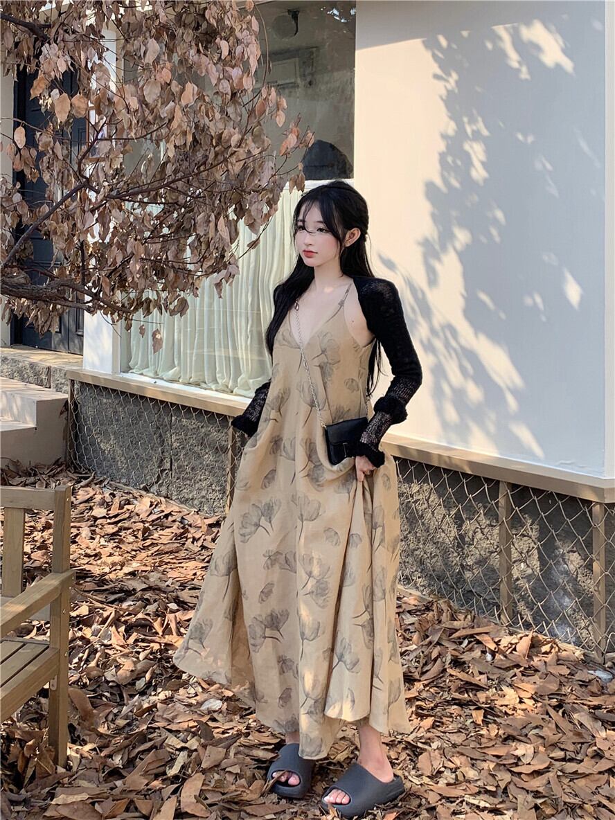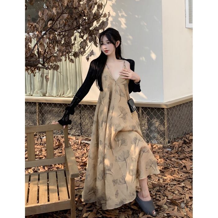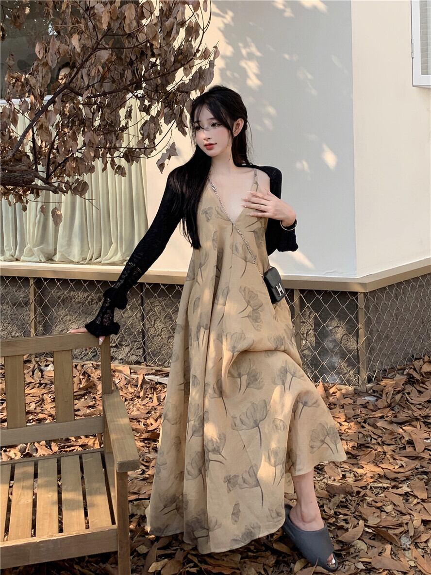 スタンダードプリント柄スタイルドレス オータムルーズカジュアルロングスカート レトロ 秋物 10/5 秋冬 オータム ウインター ナチュラル mi4655071832536