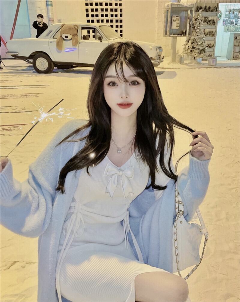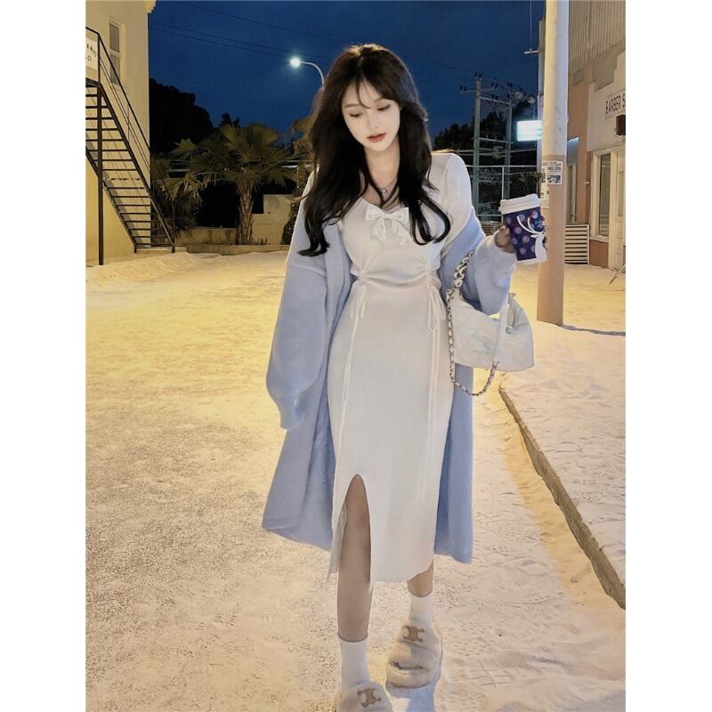 色:白いワンピースのワンピース,ブルーカーディガンワンピース