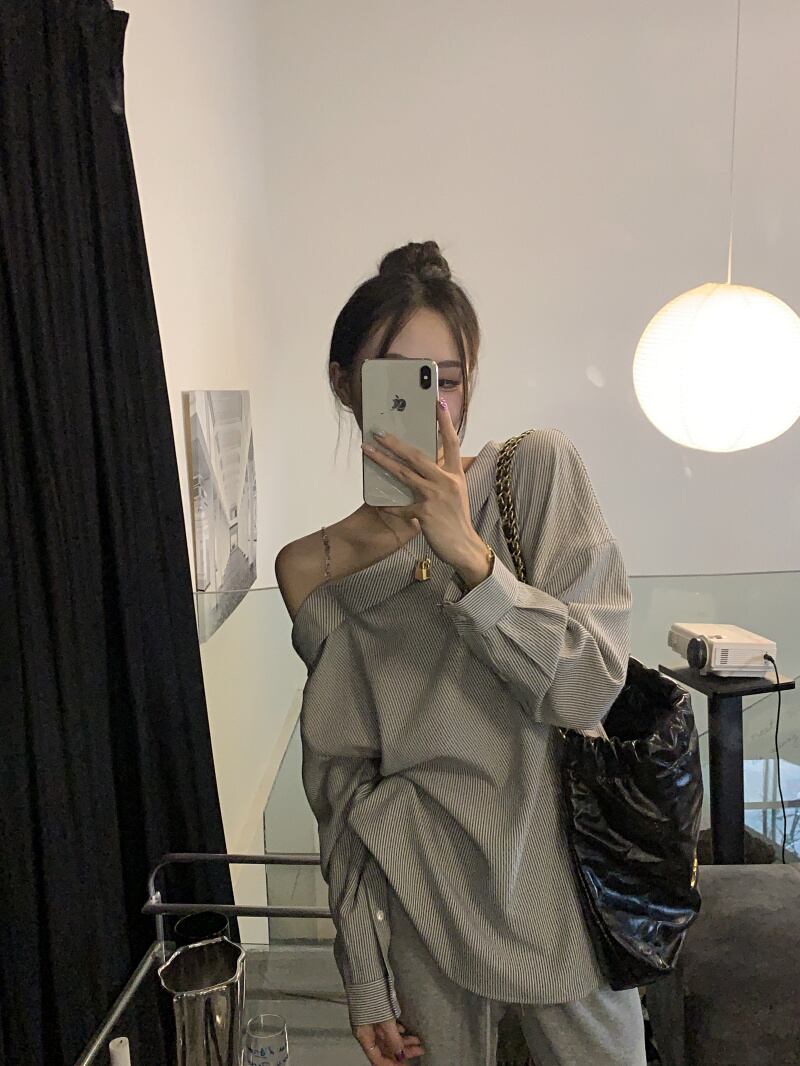 ストライプチェーン シャツ オータムルーズトップス ロング 秋物 10/5 秋冬 オータム ウインター ナチュラル mi4642111612893