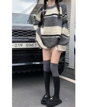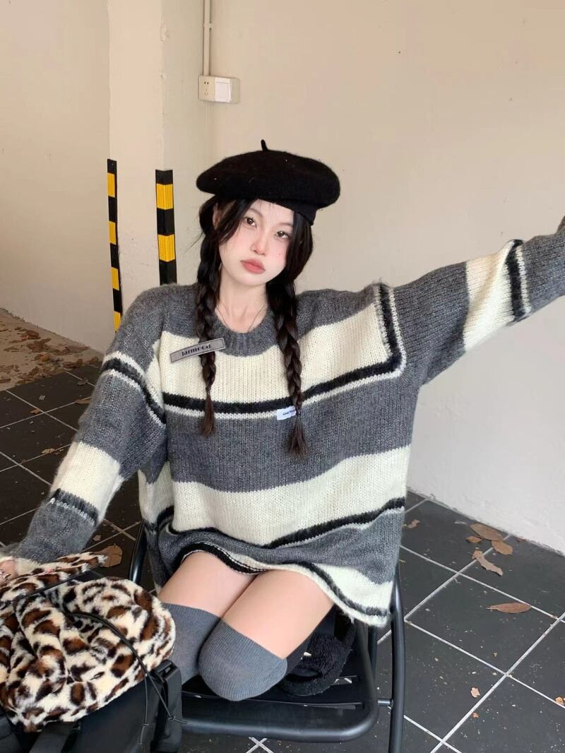 スタンダードカラーストライプルーズセーター オータム薄手プルオーバー レトロ 秋物 10/5 秋冬 オータム ウインター ナチュラル mi4665748043348