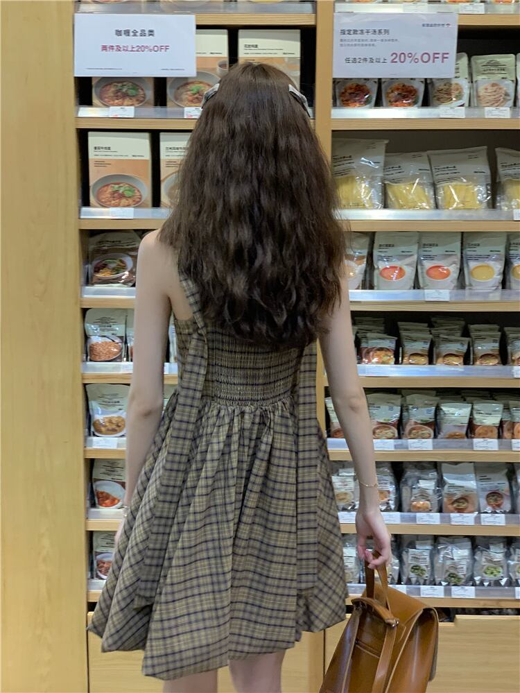 スタンダードカラー格子柄ドレス サマーウェスト薄手Aラインスカート レトロ 夏物 10/5 秋冬 オータム ウインター ナチュラル mi4621620479554