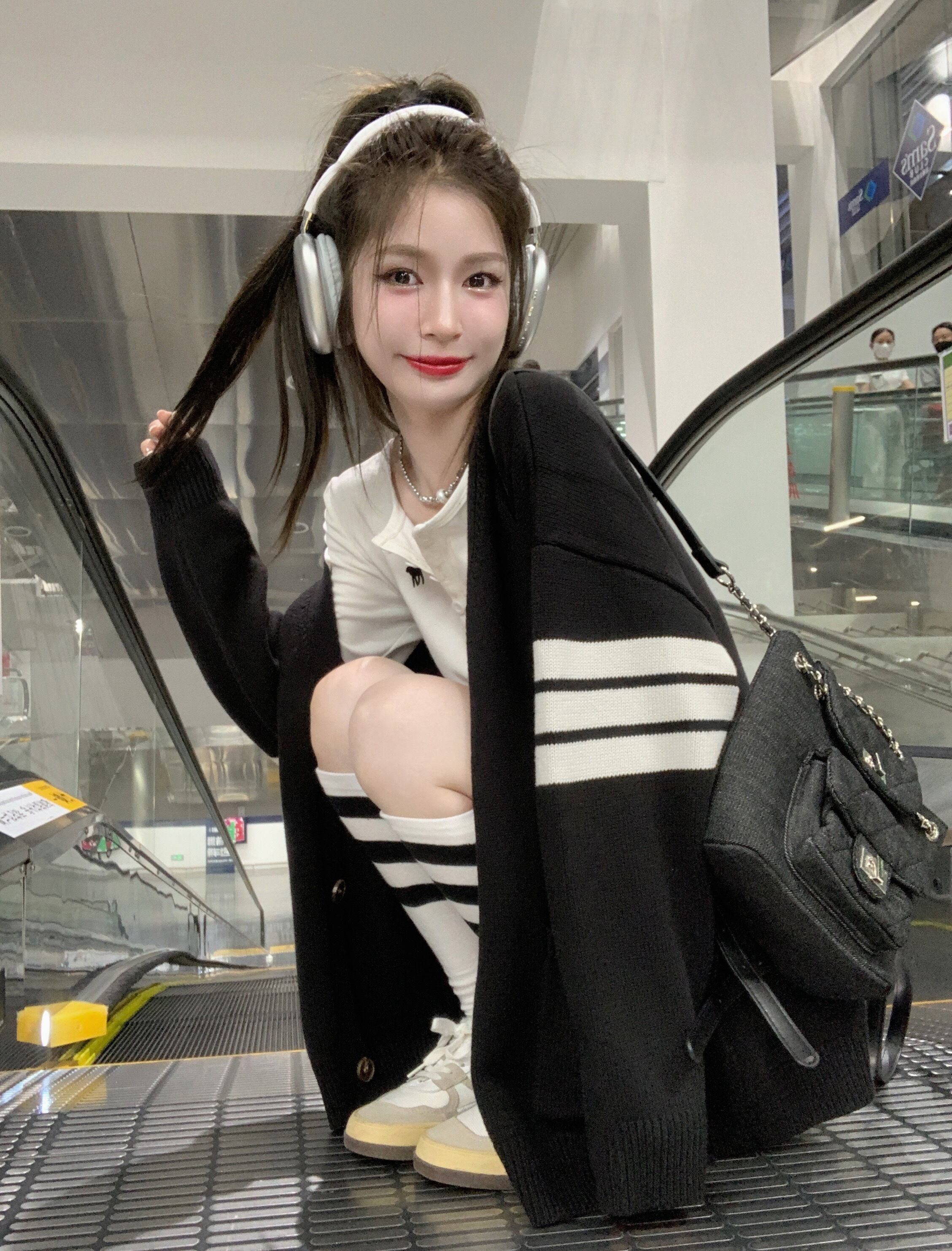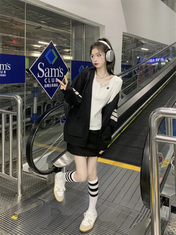 色:ブラックカーディガンセーター,ホワイトボトミングシャツ,黒のハーフスカートワンピース