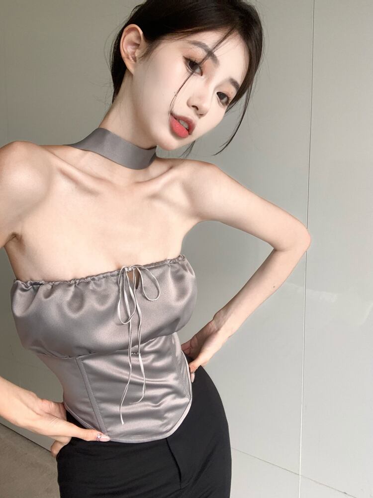 サテンサマースリムショートトップス ピンク レース 夏物 レースアップ 10/5 秋冬 オータム ウインター ナチュラル mi4669534548156