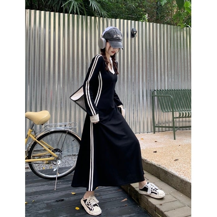 スタンダードVネックロングドレス オータムウェスト薄手スカート カジュアル レトロ 秋物 10/5 秋冬 オータム ウインター ナチュラル mi4675377982088