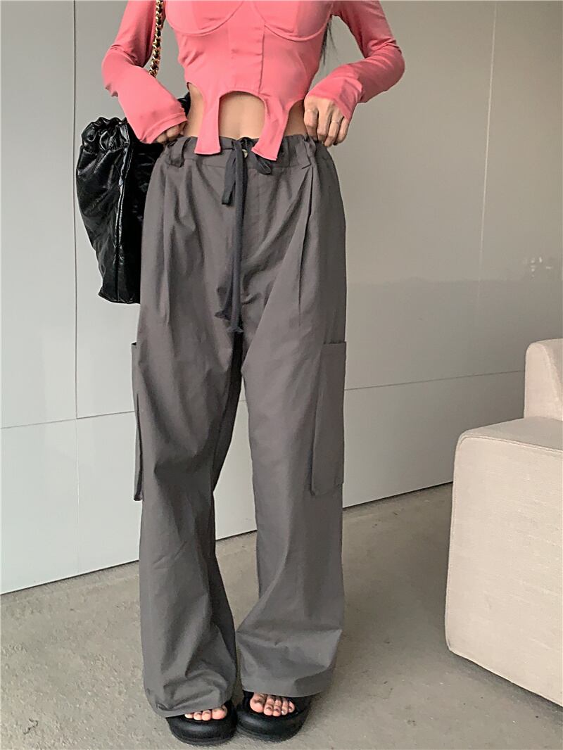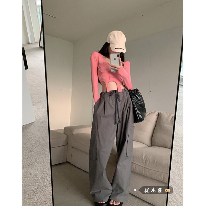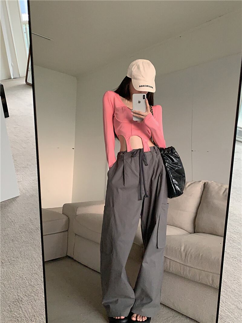 色:ピンクのTシャツトップ,グレーのオーバーオール