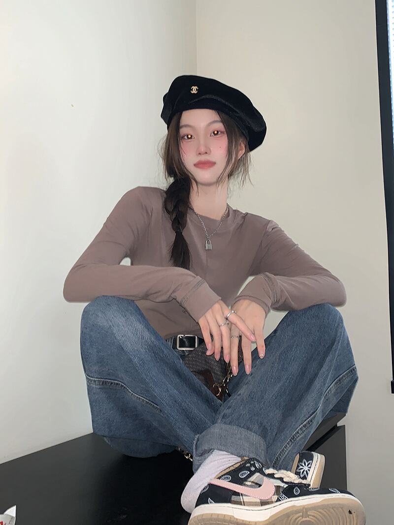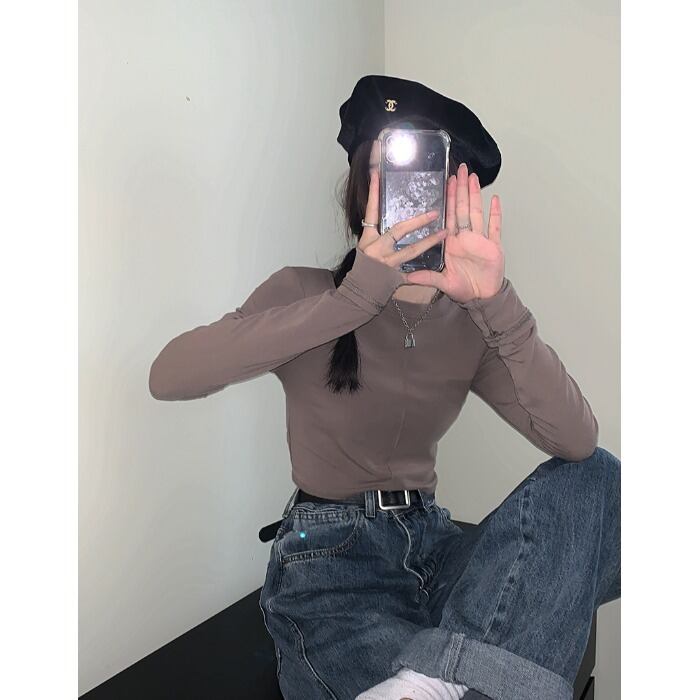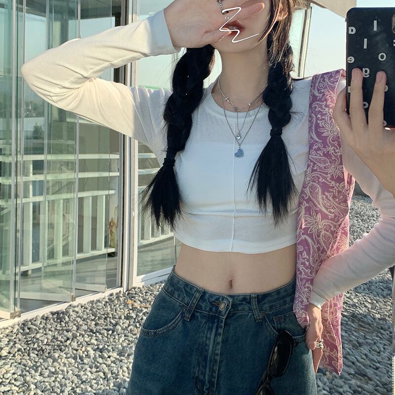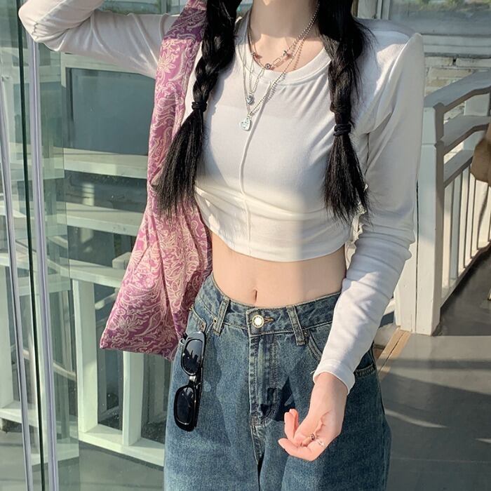 ソリッド カラーTシャツ オータムスタイルスリムショートラウンドネックトップス ロング 秋物 Oネック ピュア ソリッドカラー 10/5 秋冬 オータム ウインター ナチュラル mi4655143599684