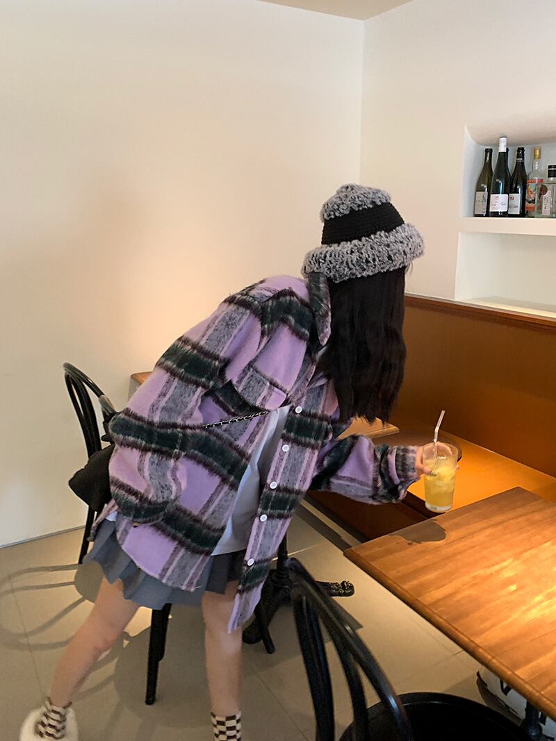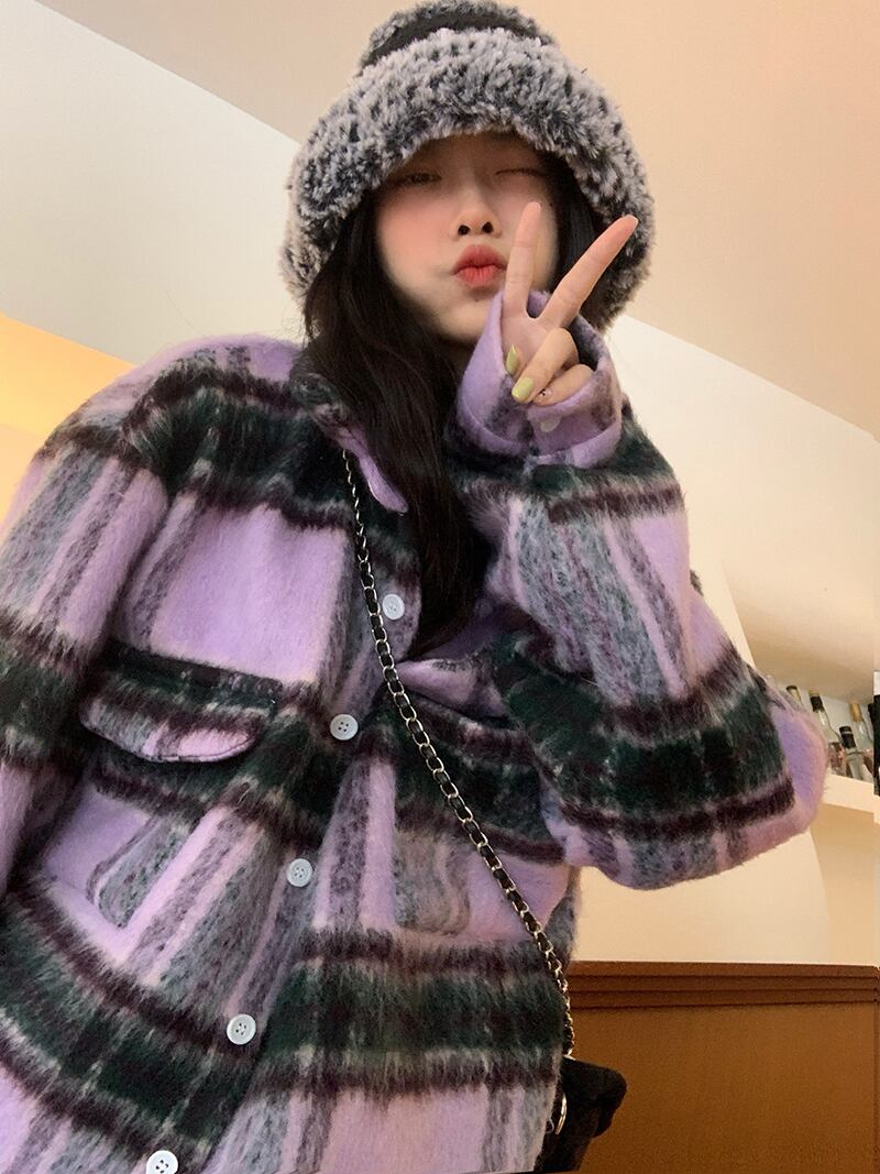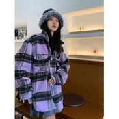 スタンダード格子柄コート オータムルーズトップス レトロ 秋物 パープル 10/5 秋冬 オータム ウインター ナチュラル mi4610617719494