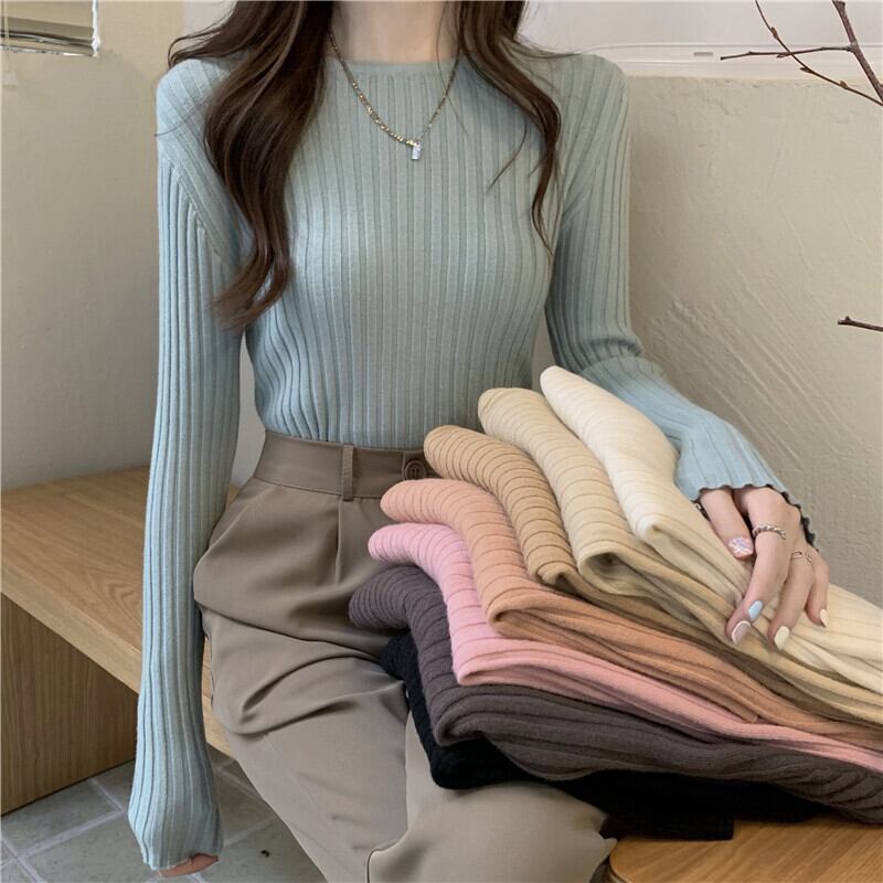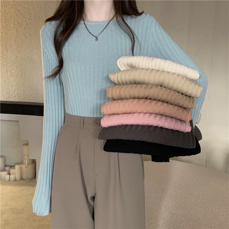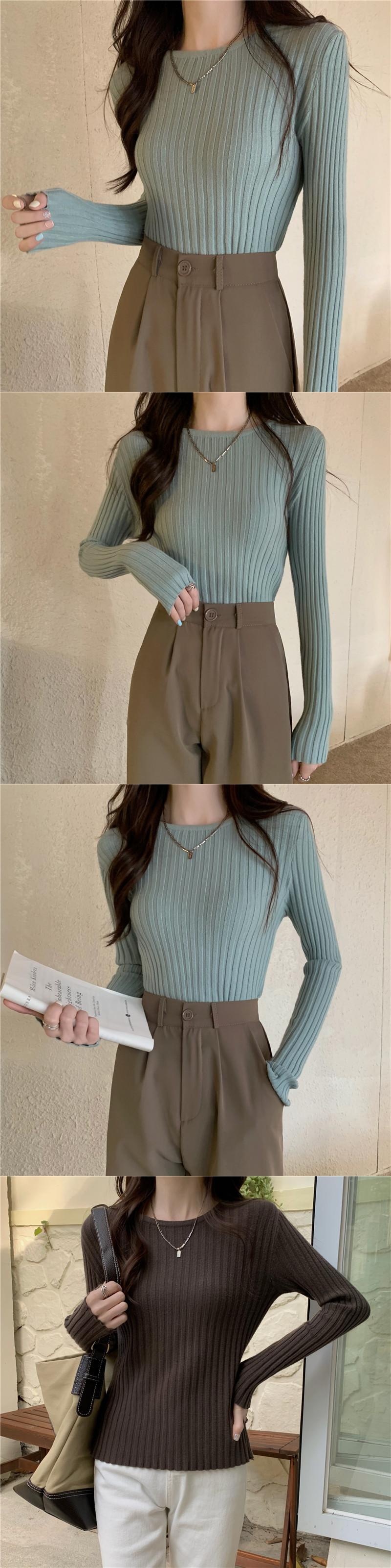オータムウィンターストライプニットシャツ薄手スリムラウンドネックトップス ロング 秋物 冬物 Oネック 10/5 秋冬 オータム ウインター ナチュラル mi4685799857393