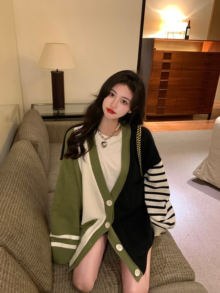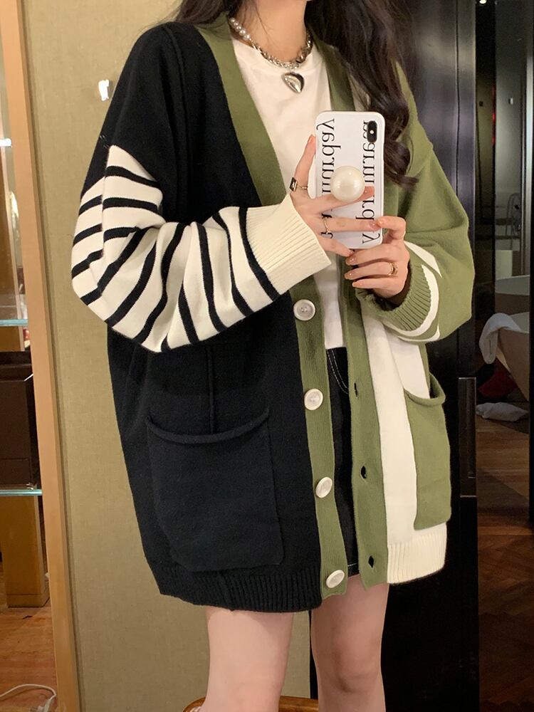 スタンダードスタイルカラーストライプVネックセーター コート オータムルーズニットカーディガン レトロ 秋物 10/5 秋冬 オータム ウインター ナチュラル mi4689004927323