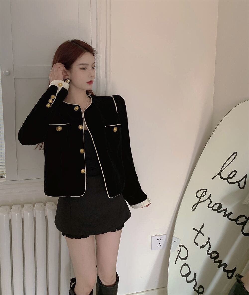ラウンドネックゴールドボタンベルベットジャケット オータムスタイルショートカーディガントップス 秋物 Oネック 10/5 秋冬 オータム ウインター ナチュラル mi464365871904