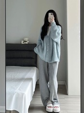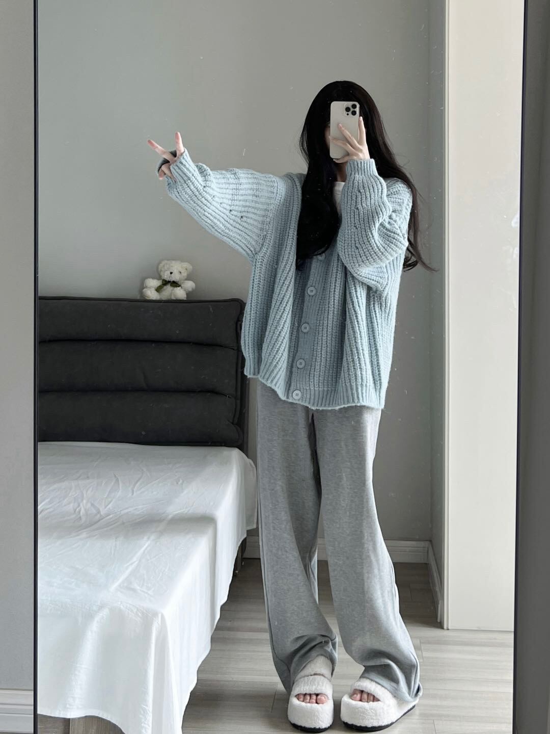 色:ブルーカーディガンワンピース,グレーのスラックス