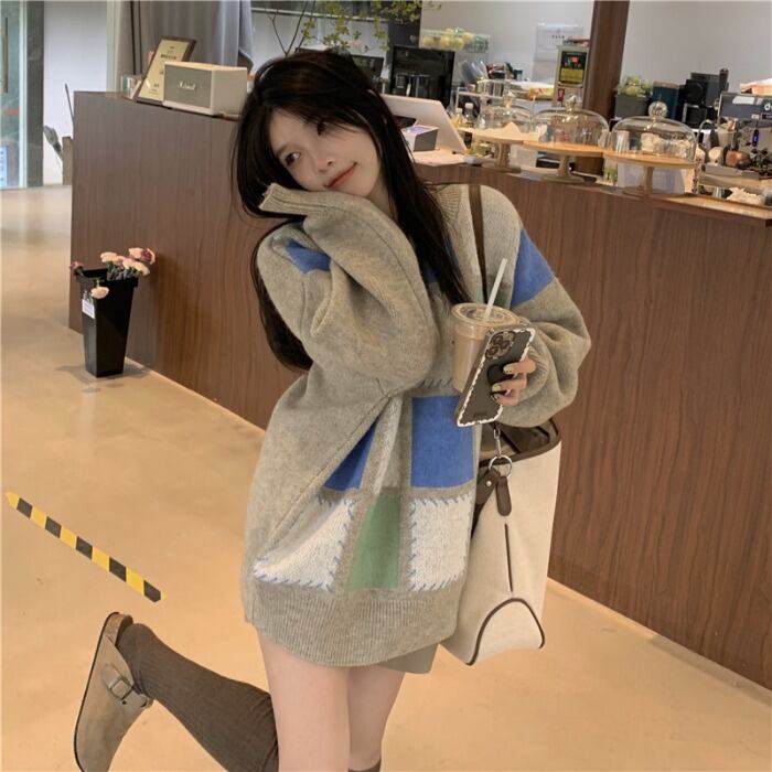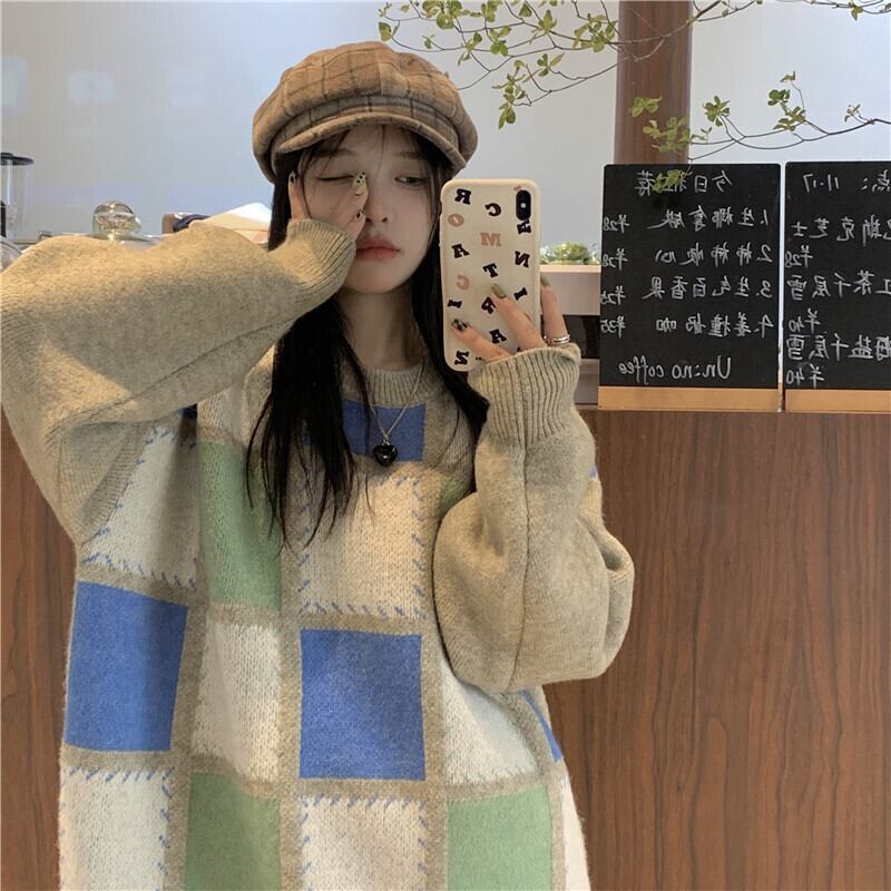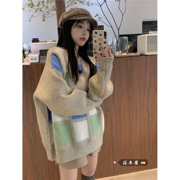 カラー格子柄プルオーバー セーター オータムウィンタースタイルルーズトップス 秋物 冬物 10/5 秋冬 オータム ウインター ナチュラル mi462199949898
