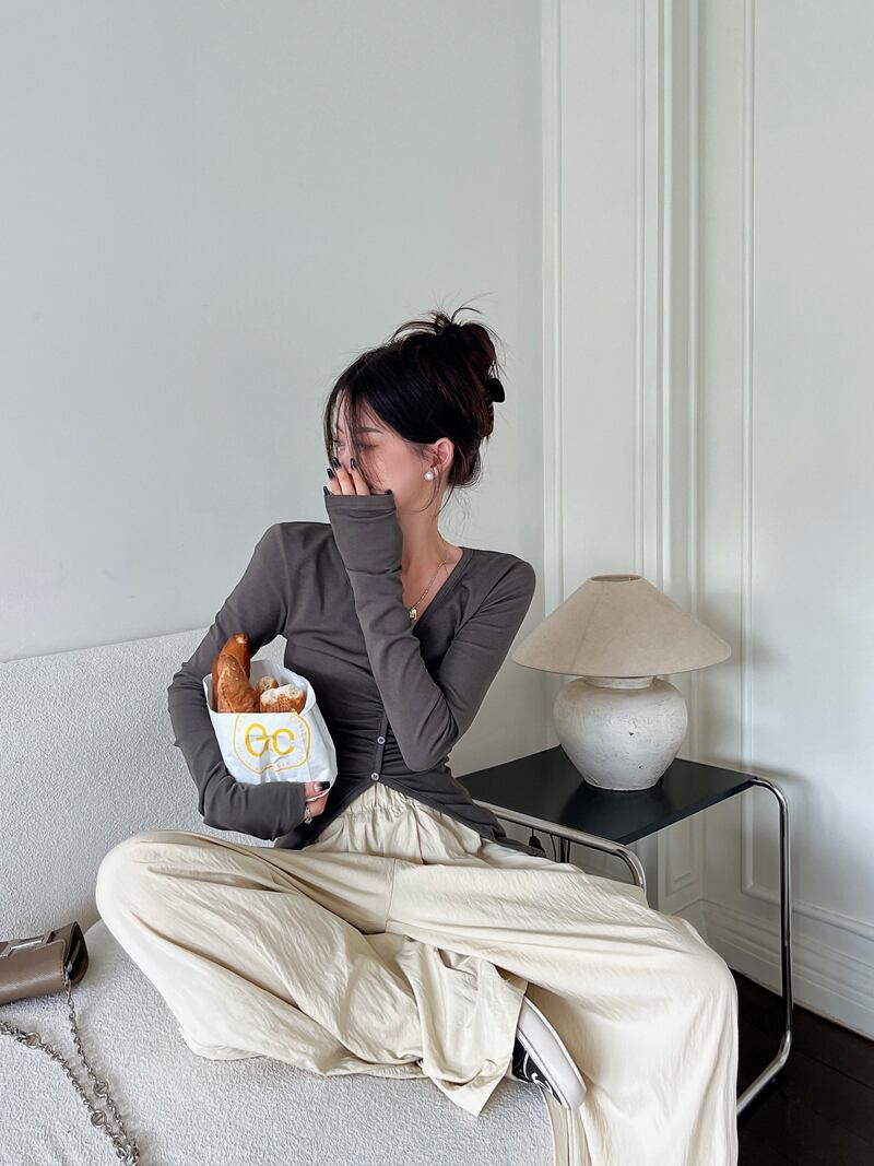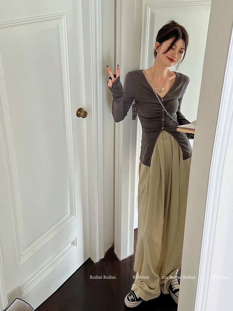プリーツスリムVネックTシャツ オータムスリット薄手トップス ロング 秋物 10/5 秋冬 オータム ウインター ナチュラル mi4677294010857