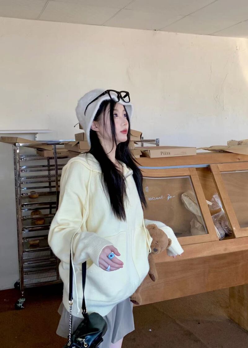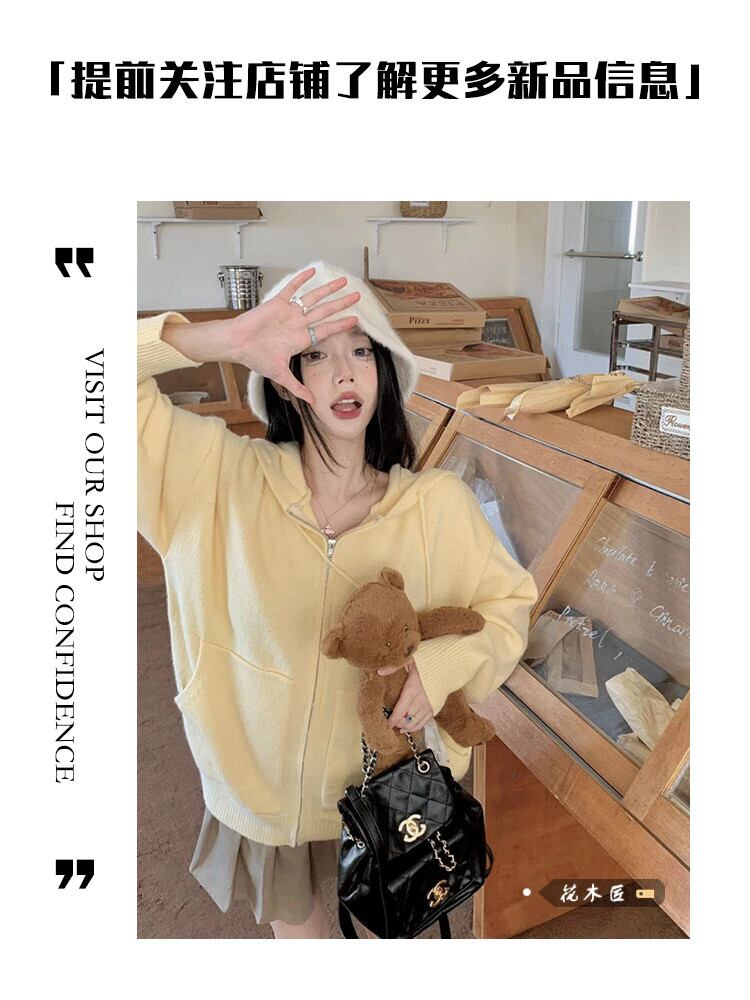 イエローフードセーター コート オータムニットカーディガントップス ロング 秋物 10/5 秋冬 オータム ウインター ナチュラル mi4657653341750