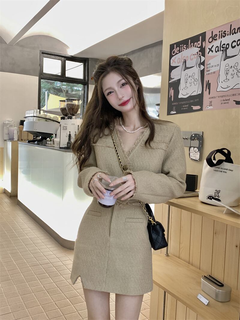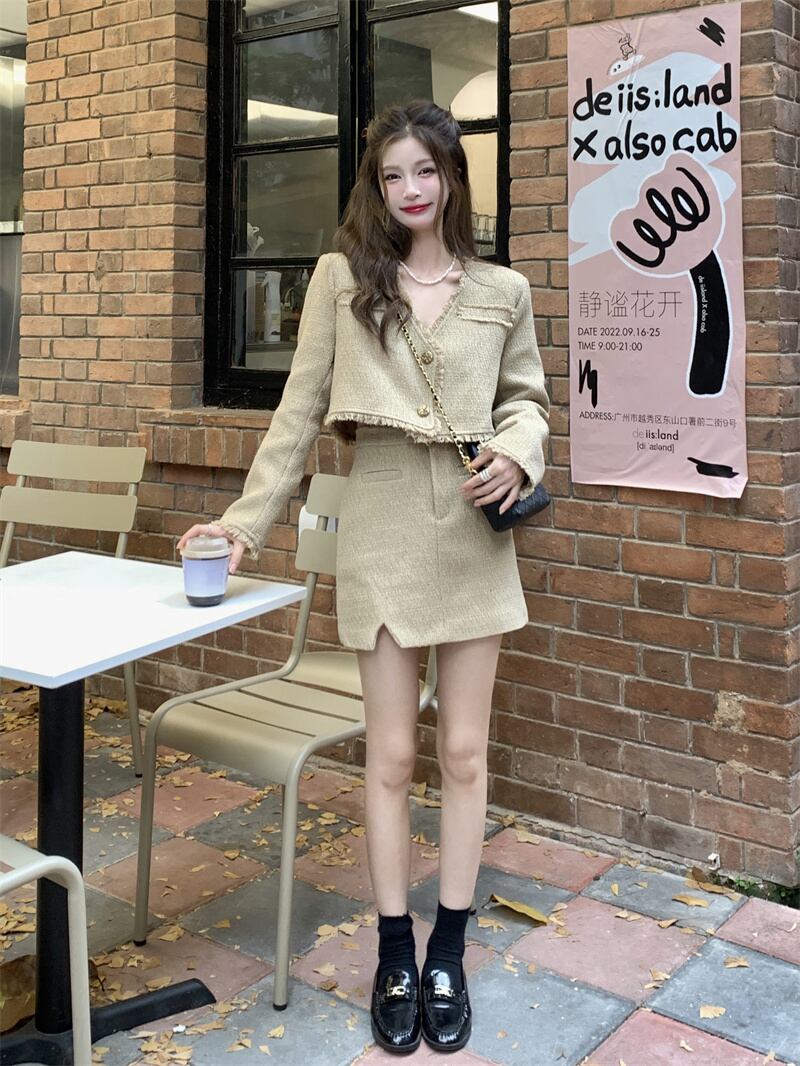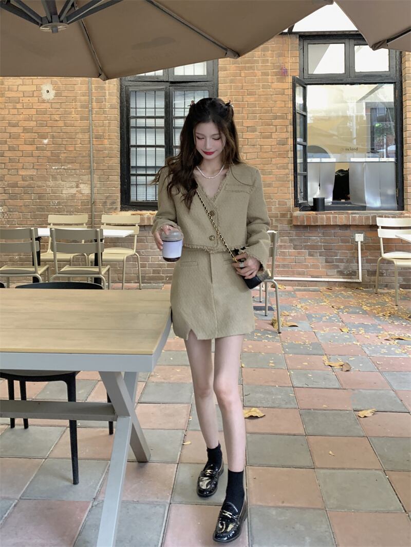 オータムツィードVネックコート ハイウェストウェストルーズスカート 秋物 10/5 秋冬 オータム ウインター ナチュラル mi4628941676039