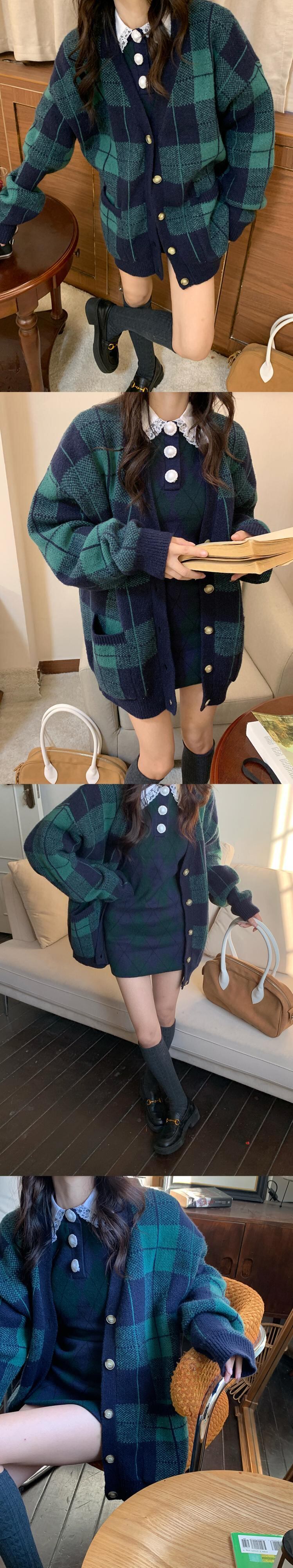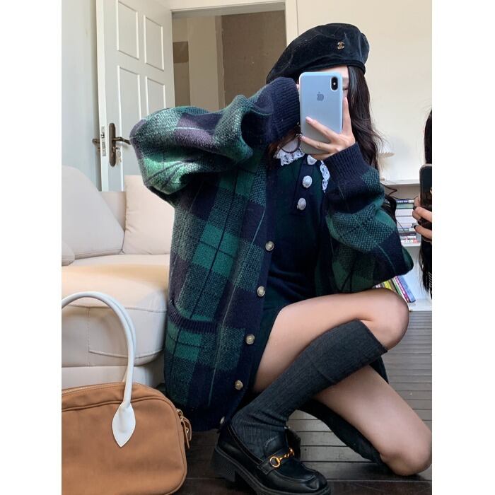 ルーズスタイルカラー格子柄セーター ジャケット オータムスタンダードニットカーディガン レトロ 秋物 10/5 秋冬 オータム ウインター ナチュラル mi4637284530123