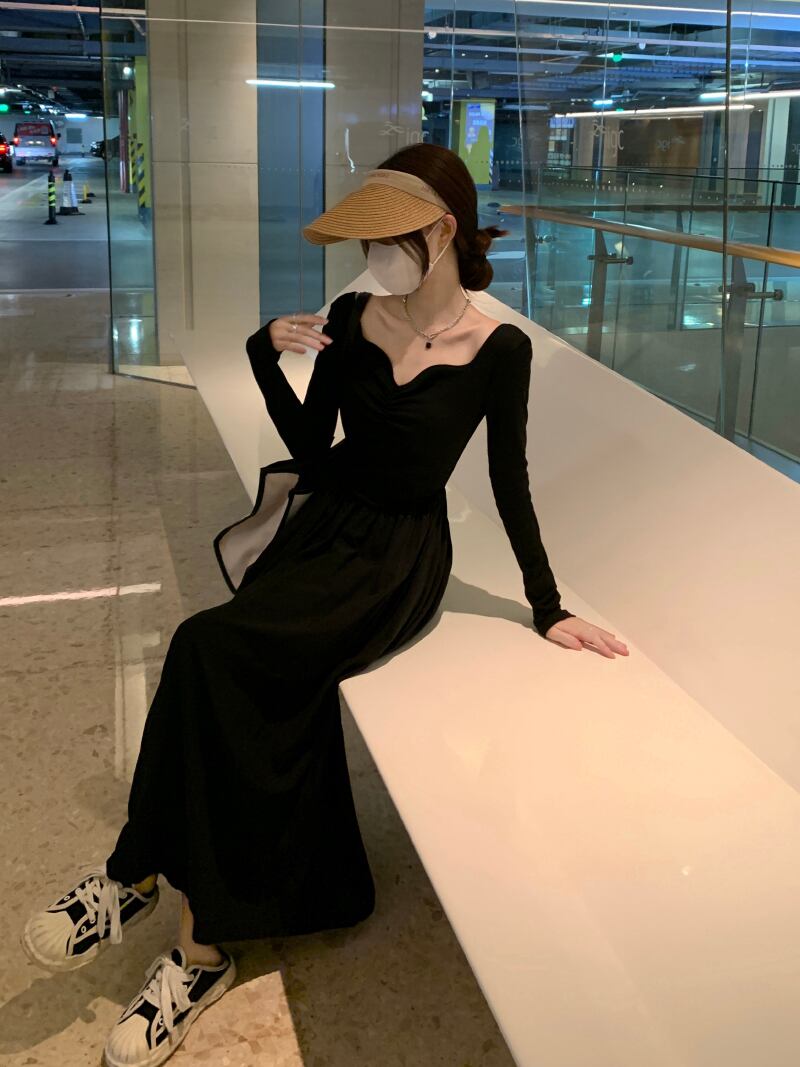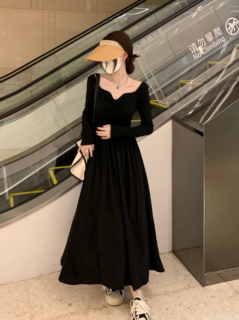 スタンダードドレス オータムウェスト薄手ブラック ロング レトロ 秋物 10/5 秋冬 オータム ウインター ナチュラル mi4650929104050