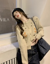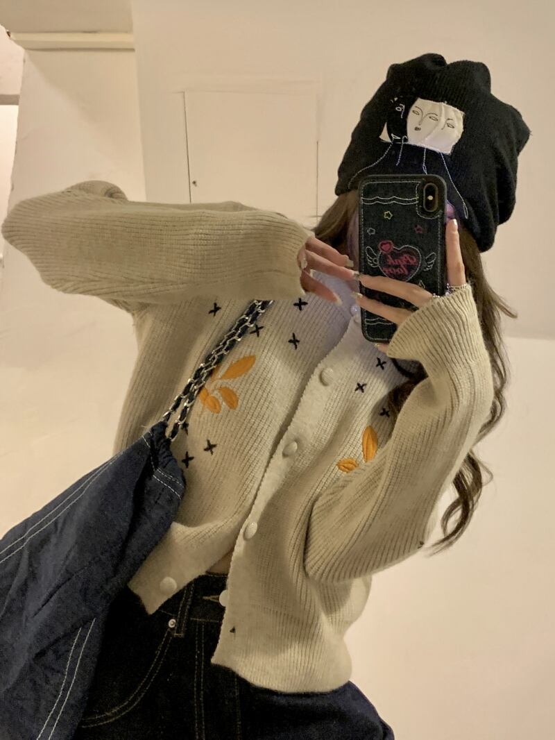 スタンダードショートセーター コート オータムルーズニットカーディガントップス ロング レッド レトロ 刺繍 秋物 10/5 秋冬 オータム ウインター ナチュラル mi461851147380