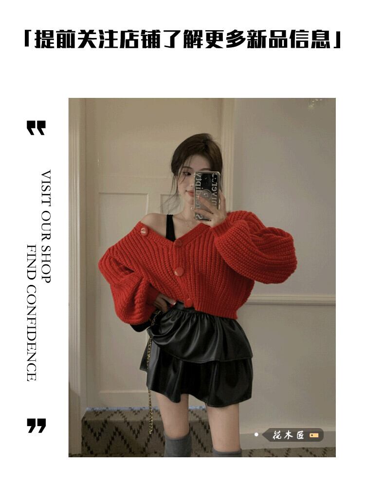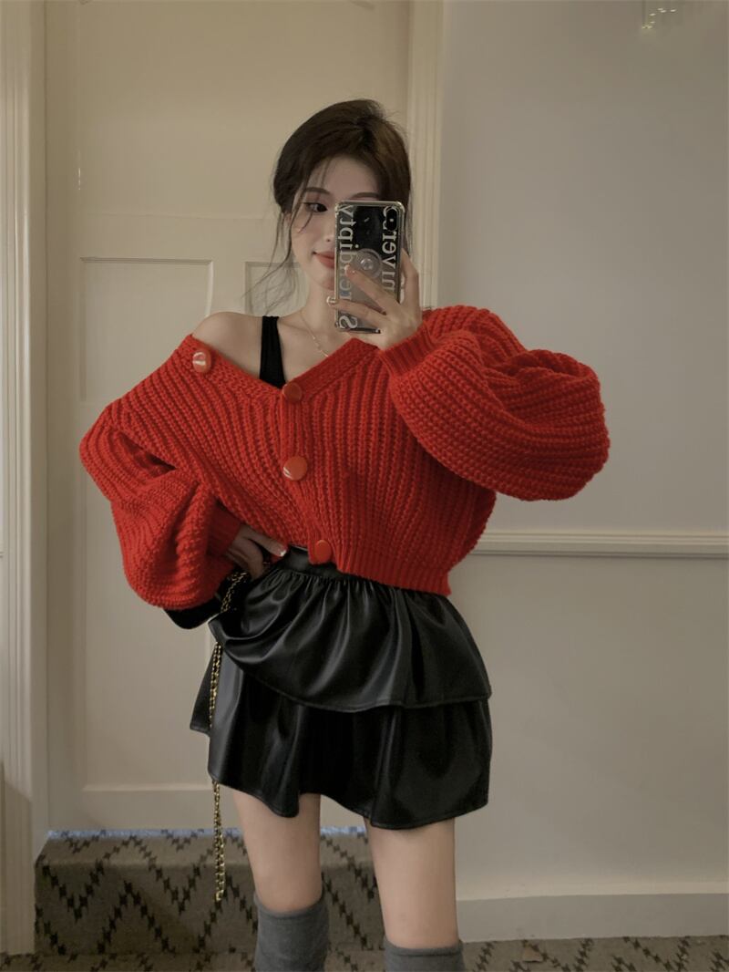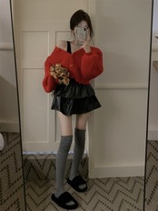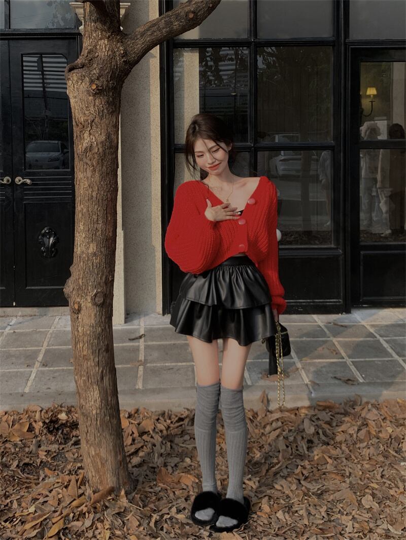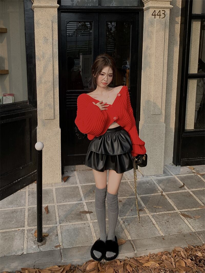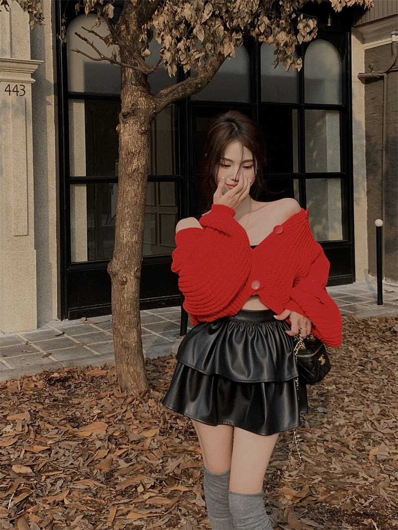 色:赤いセーターシングル,ブラックレザースカートシングル