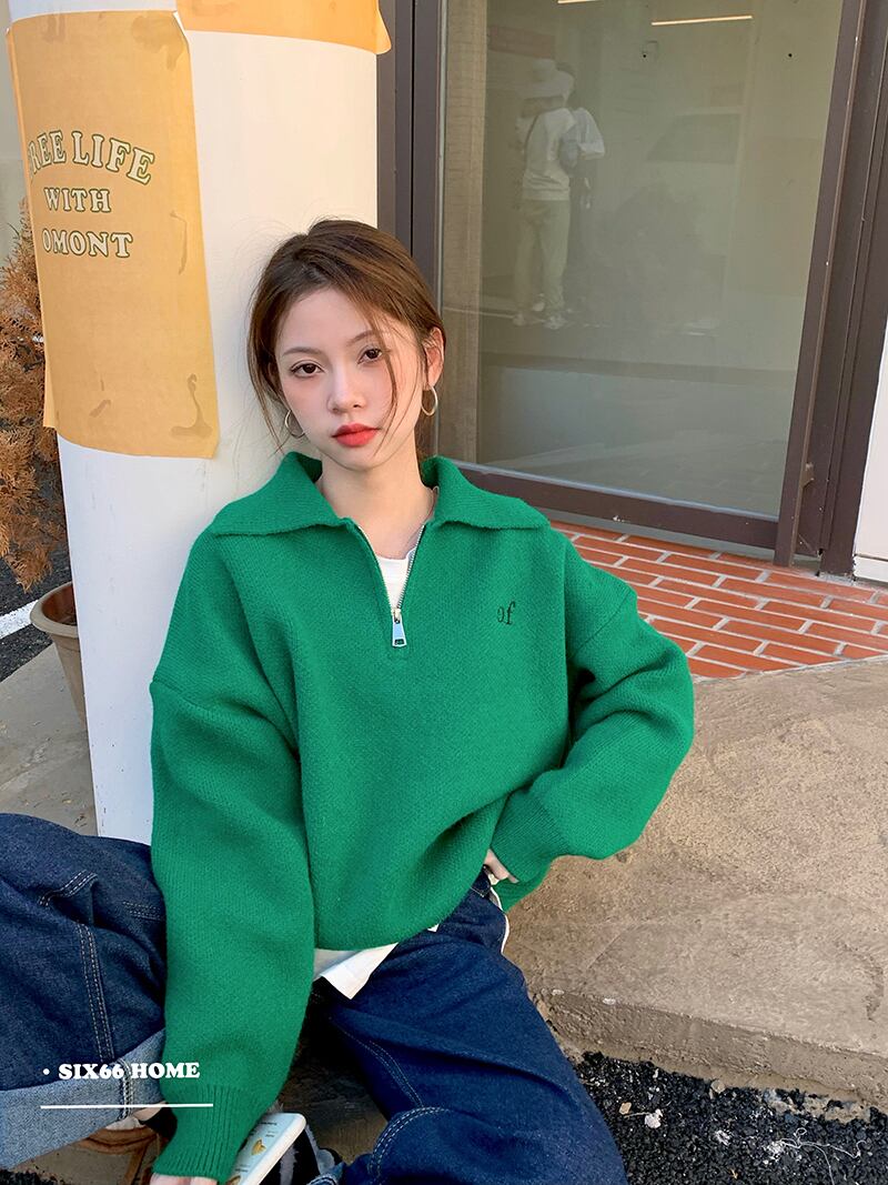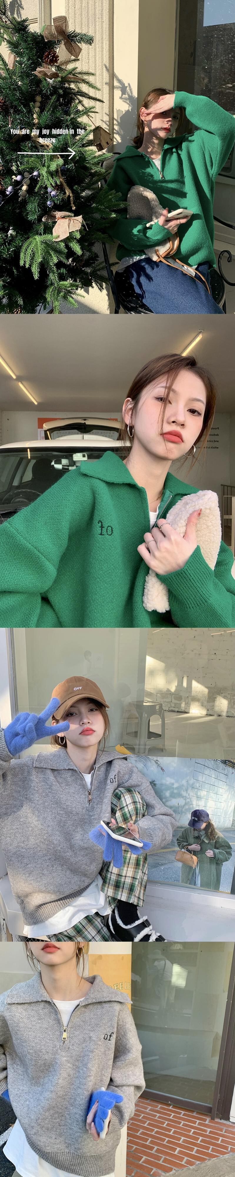 ルーズジッパーカラーセーター オータム刺繍薄手シャツ ロング 秋物 10/5 秋冬 オータム ウインター ナチュラル mi4640150028885