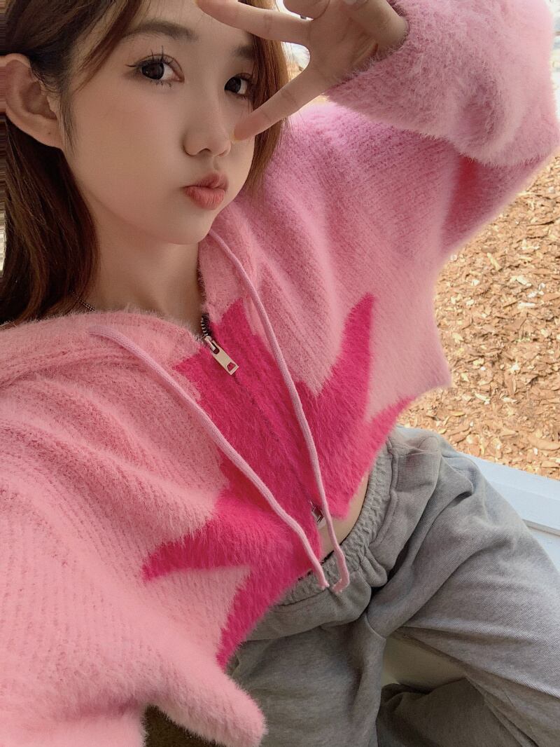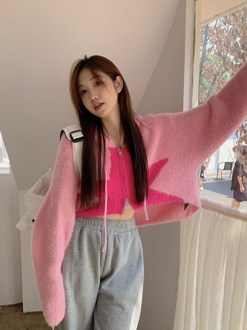 プリント柄セーター ジャケット オータムルーズショートフードニットカーディガン 秋物 10/5 秋冬 オータム ウインター ナチュラル mi4663602516363