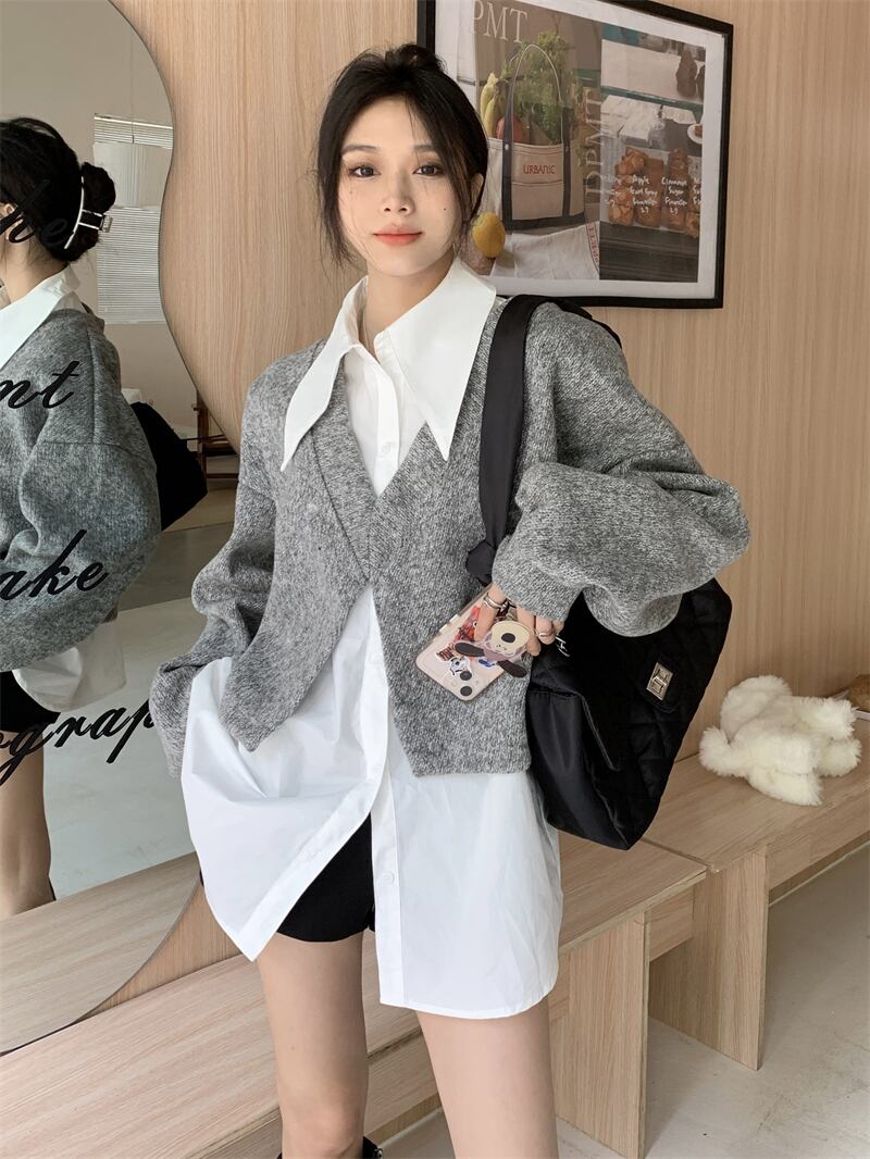色:白いシャツのワンピース,グレーコートシングルピース