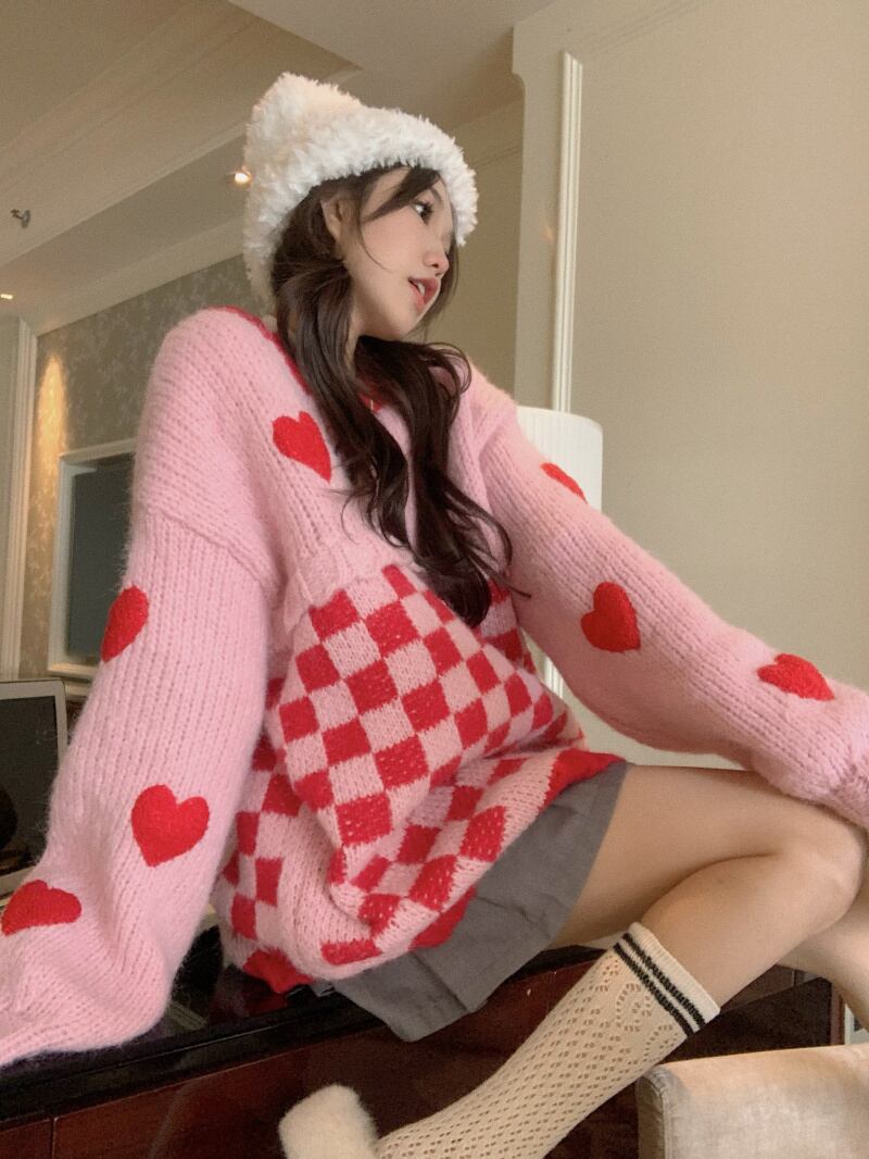 格子柄セーター コート オータムルーズニットトップス ピンク 大人ガーリー スウィート キュート カジュアル 秋物 10/5 秋冬 オータム ウインター ナチュラル mi4685218351140