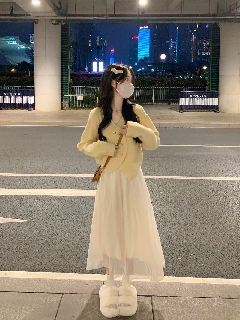 色:青いセーター,黄色いセーター,ワンピースアプリコットスカート