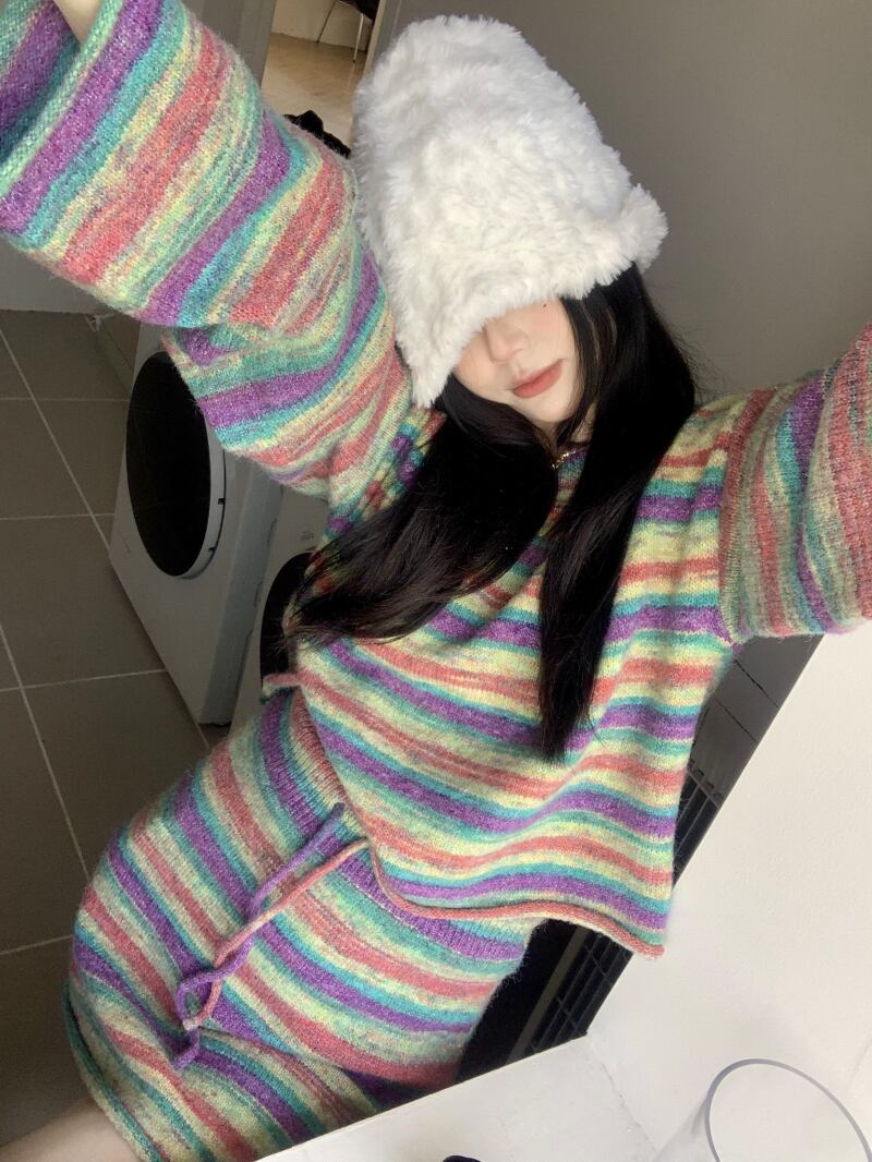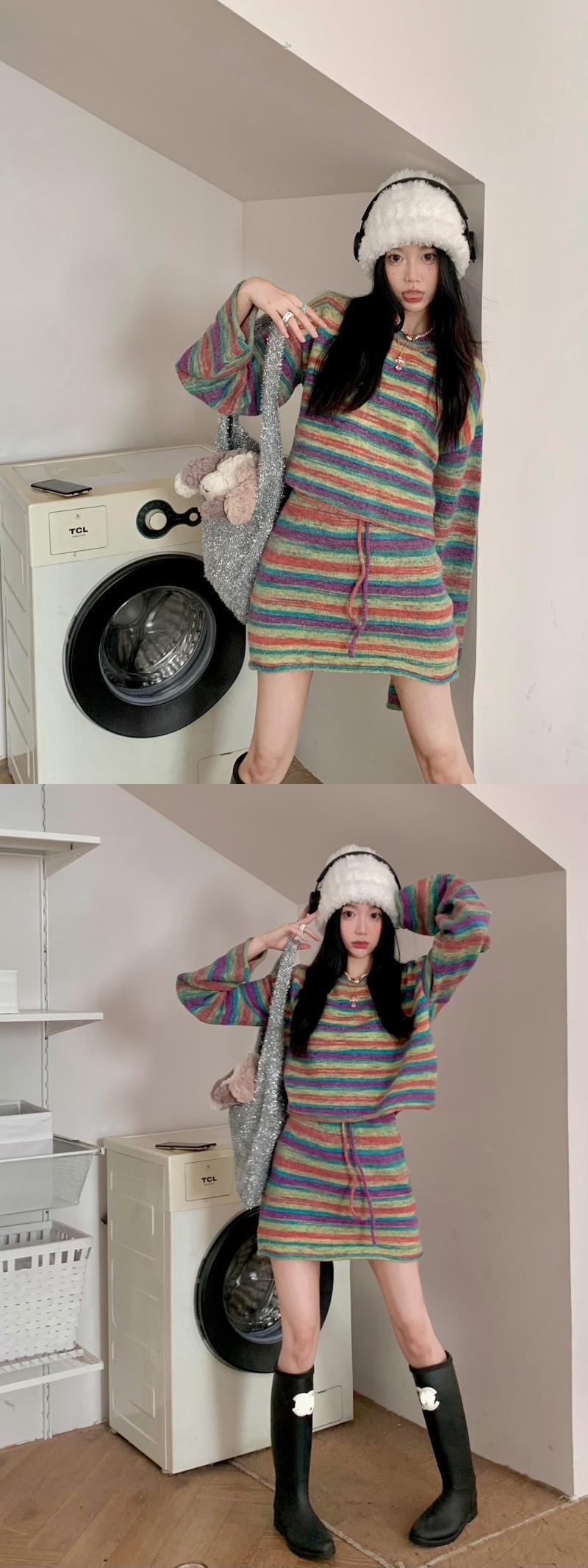 ストライプオータム薄手ニットセーター スカート セット ストリート 秋物 10/5 秋冬 オータム ウインター ナチュラル mi4662342965258