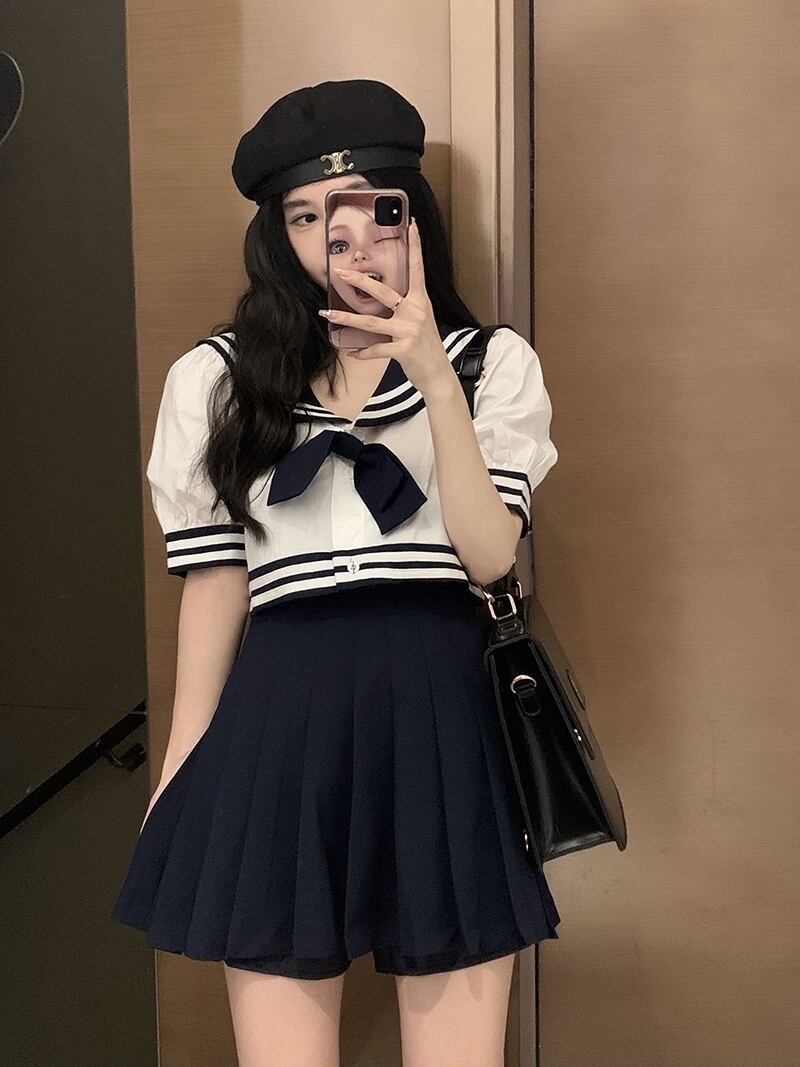色:ワンピースカラーブロックシャツ,シングルプリーツスカート