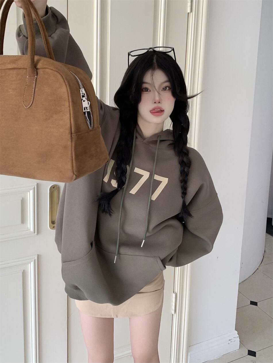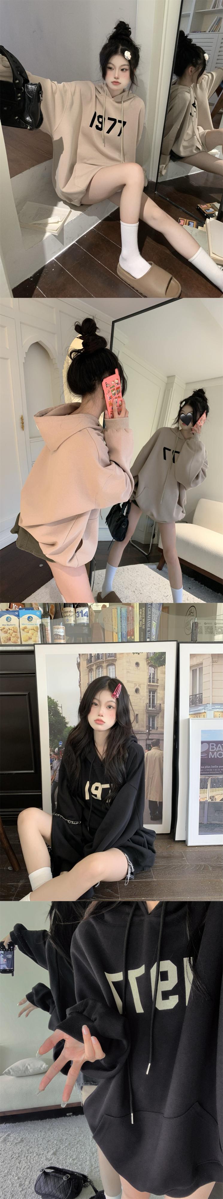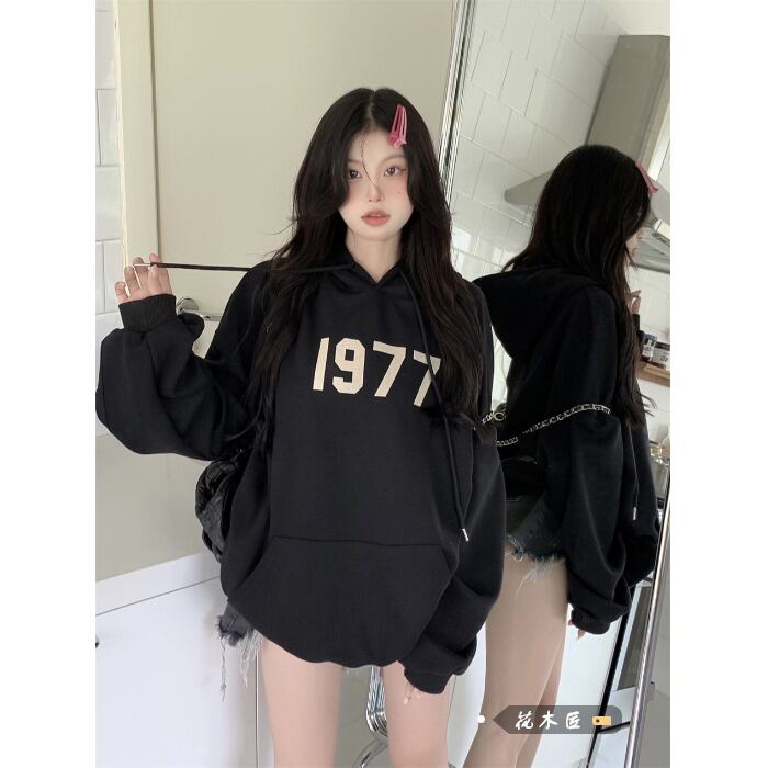 スタンダードプリント柄ブラックフードセーター オータムウィンタールーズトップス レトロ 秋物 冬物 10/5 秋冬 オータム ウインター ナチュラル mi4686300568424