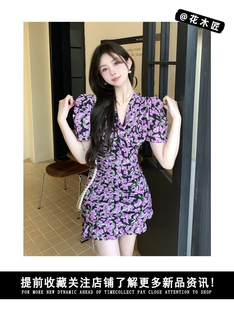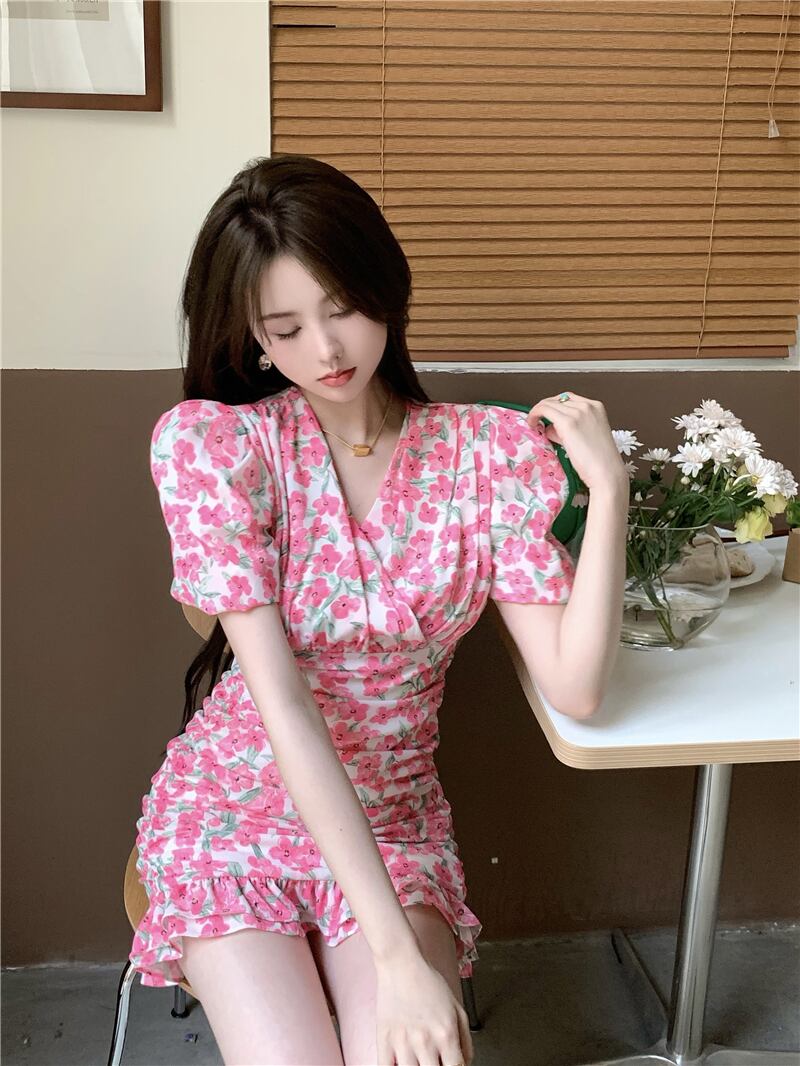 フローラルスリーブドレス サマーVネックプリーツウェストスカート ピンク 夏物 花柄 10/5 秋冬 オータム ウインター ナチュラル mi4656324965989