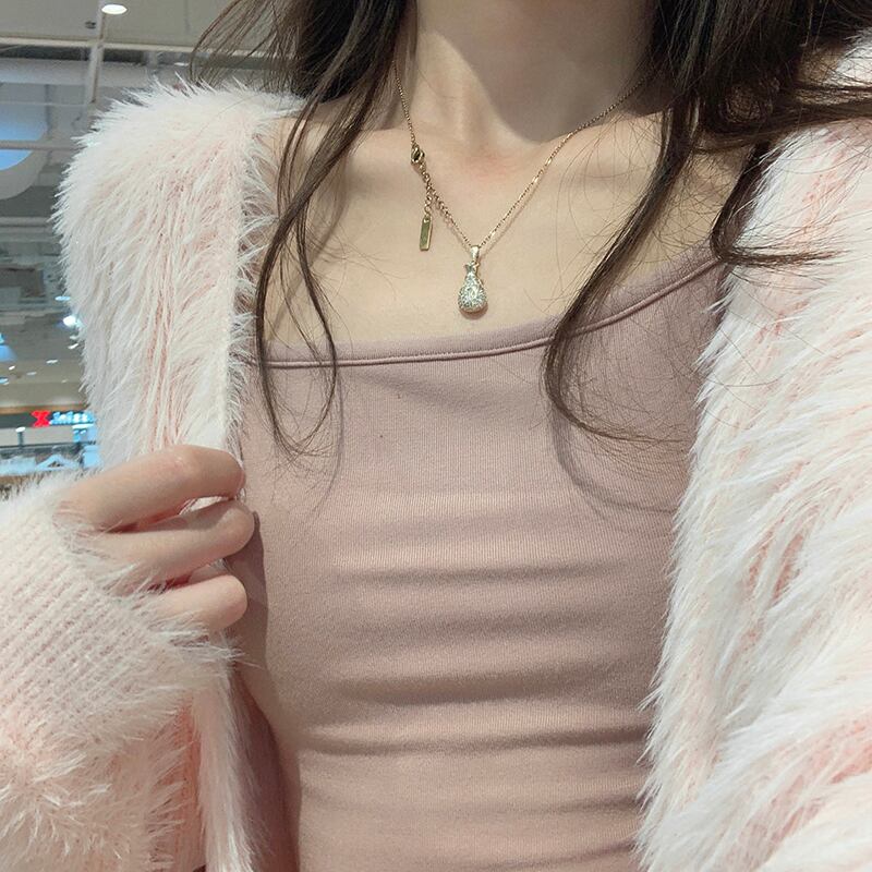 色:ピンクのスリングワンピース,オフホワイトのワイドレッグパンツ,ライトピンクミンクカーディガン