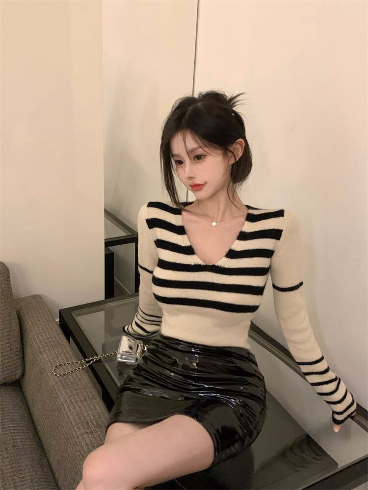 Vネックストライプセーター オータムスリムトップス ロング 秋物 10/5 秋冬 オータム ウインター ナチュラル mi4632858850744