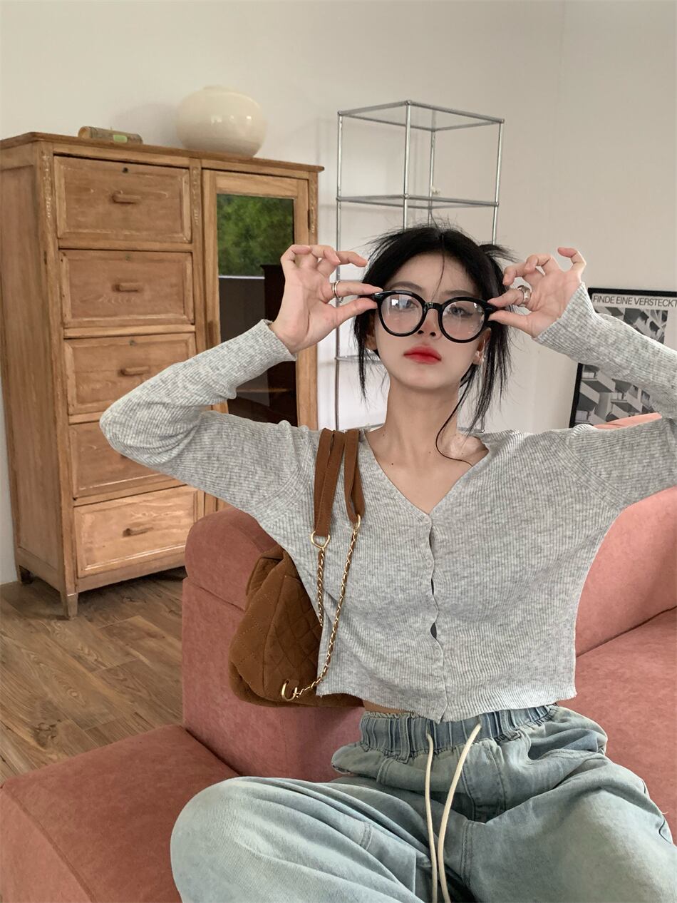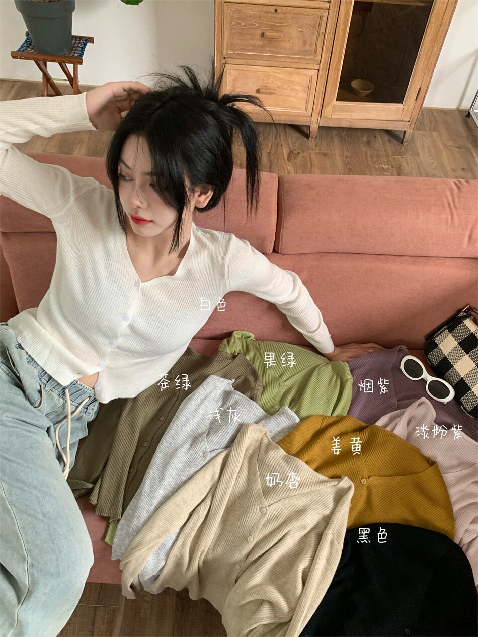 オータムソリッド カラーVネックニットカーディガンスタイルスリムショートトップス 秋物 ソリッドカラー 10/5 秋冬 オータム ウインター ナチュラル mi4666117648709