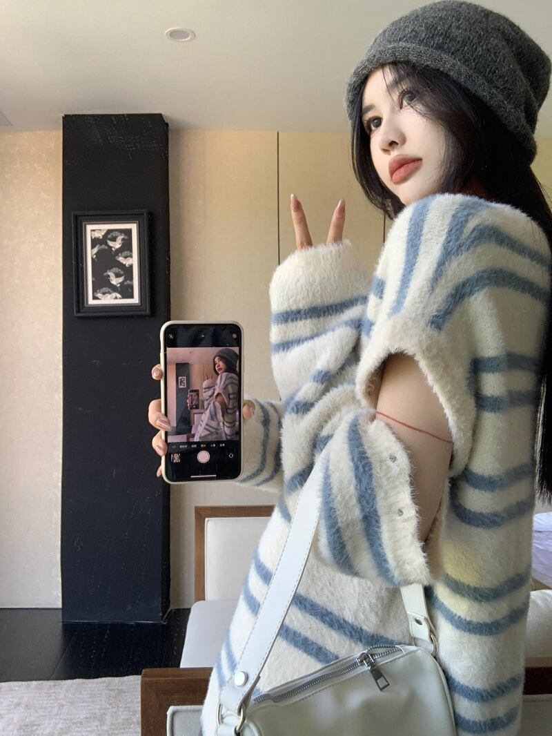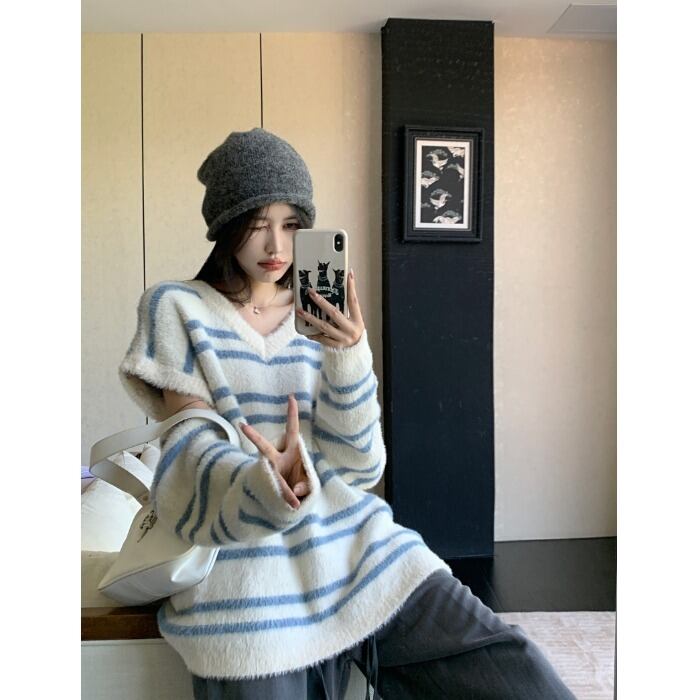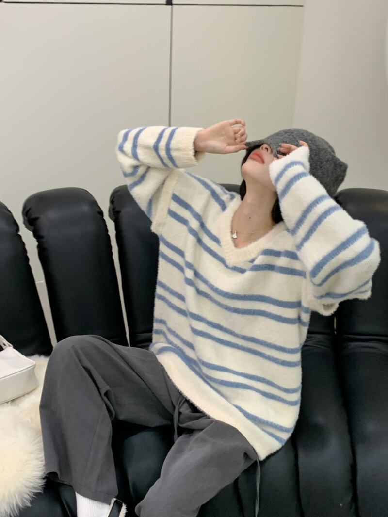 ストライプVネックセーター オータムルーズニットトップス 秋物 10/5 秋冬 オータム ウインター ナチュラル mi4615425653094