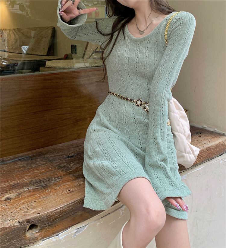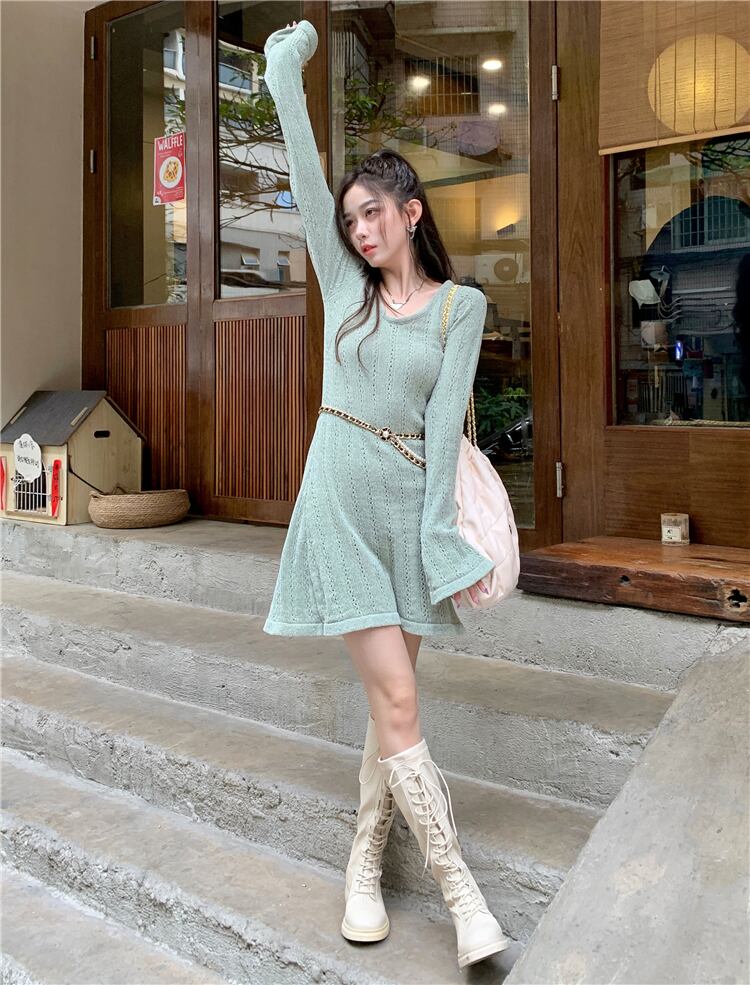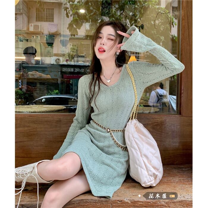 スタイルVネックドレス オータムソリッド カラーウェストAラインスカート ロング 秋物 ピュア ソリッドカラー 10/5 秋冬 オータム ウインター ナチュラル mi4682495876958
