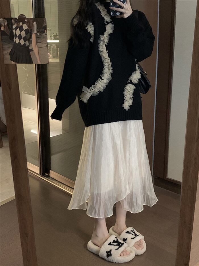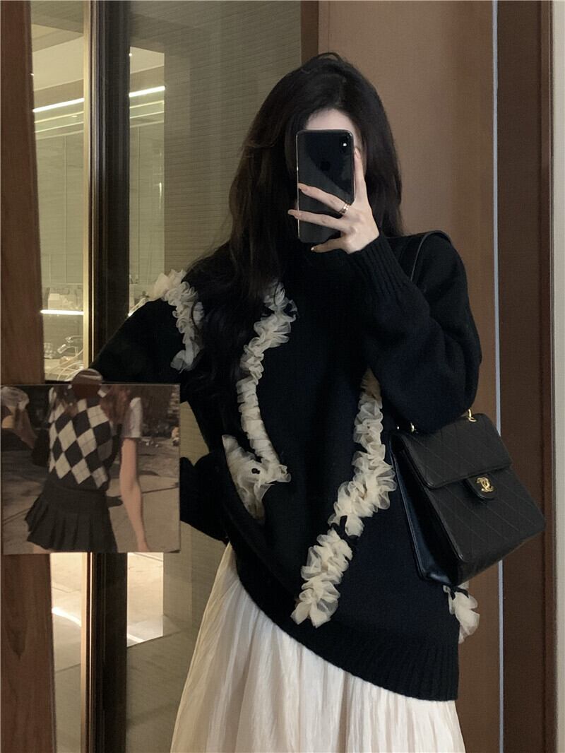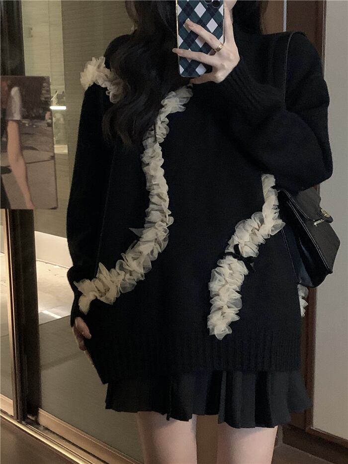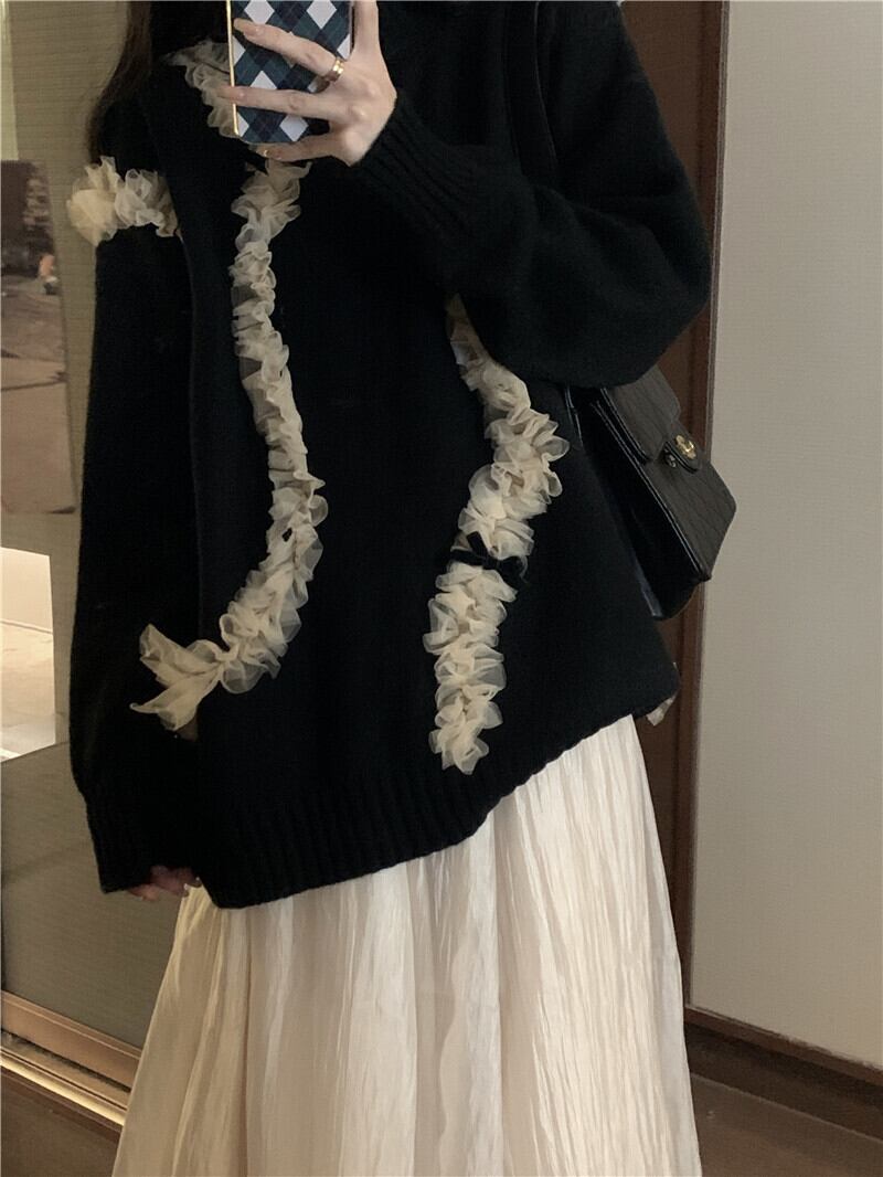 スタイルブラックメッシュセーター オータムスタンダードルーズニットトップス ロング レトロ 大人ガーリー スウィート キュート カジュアル 秋物 ステッチ 10/5 秋冬 オータム ウインター ナチュラル mi4665778697552