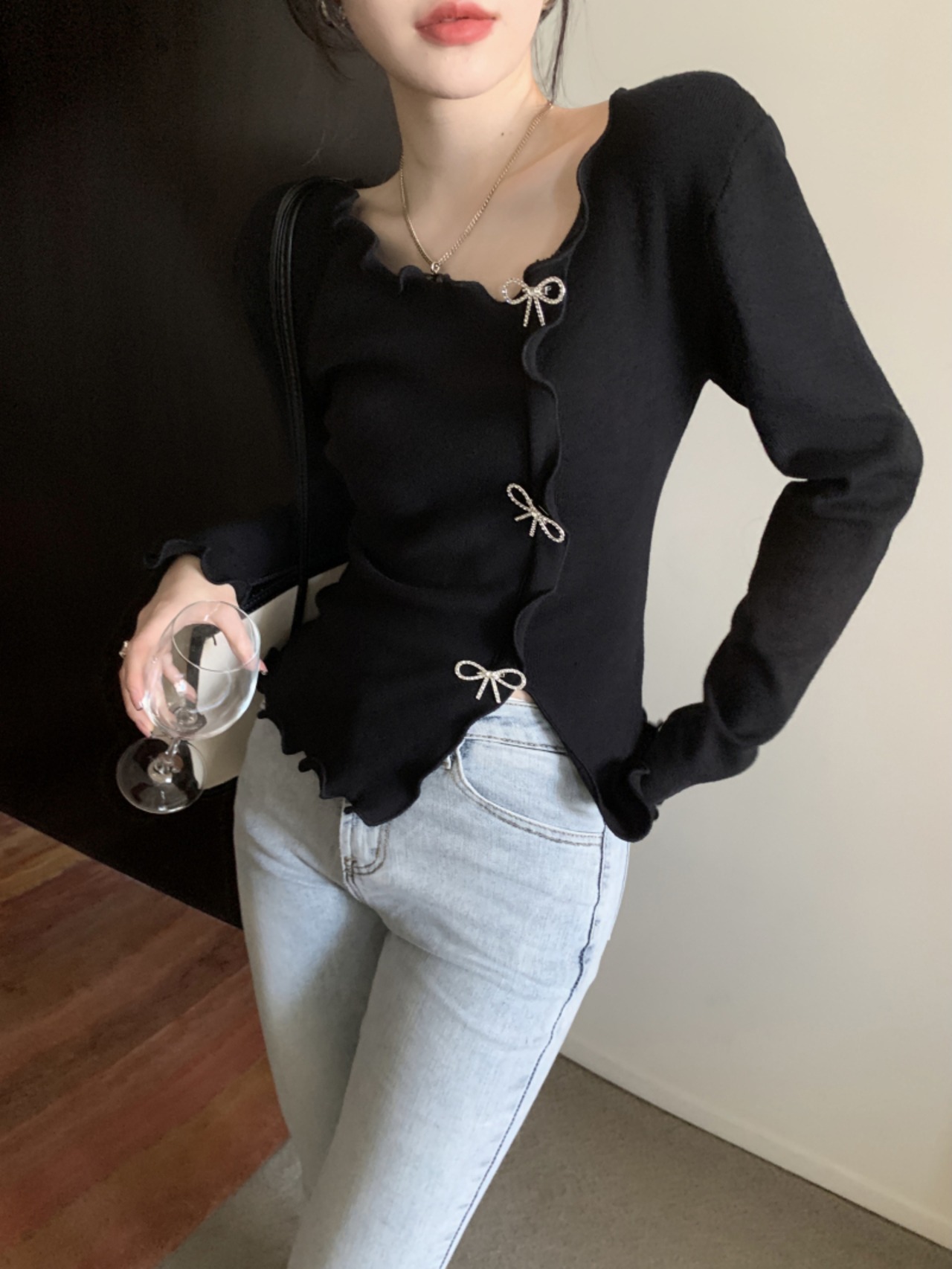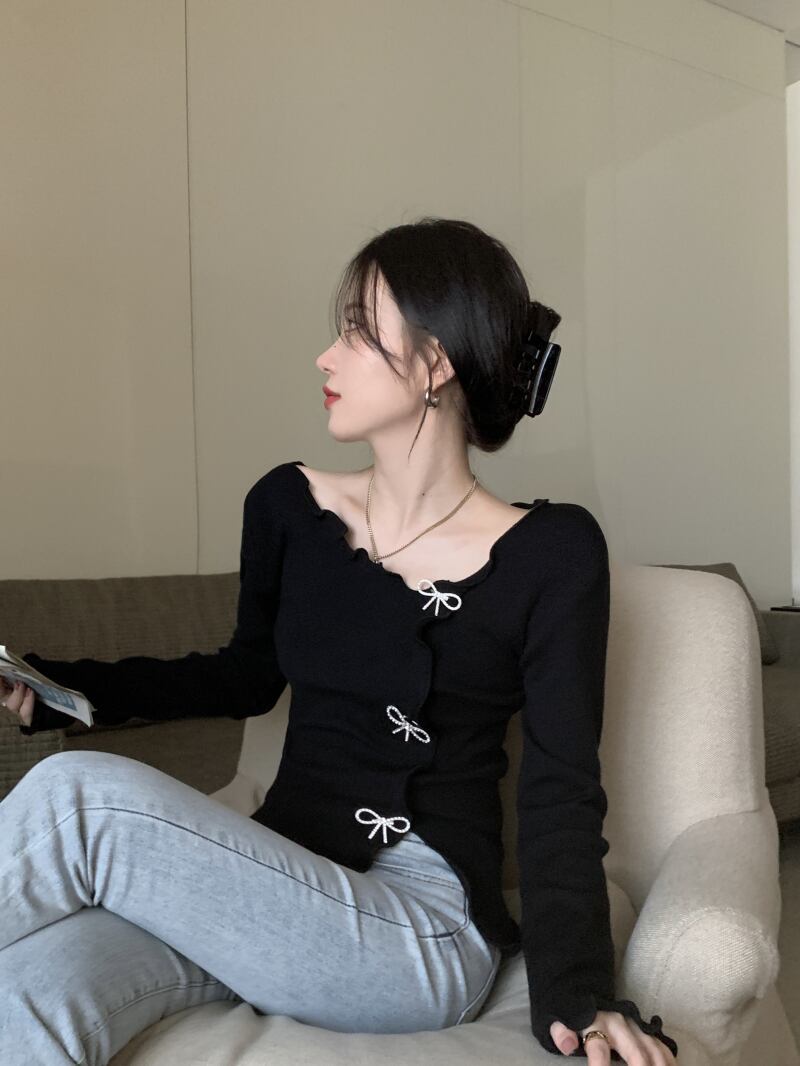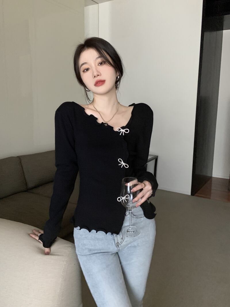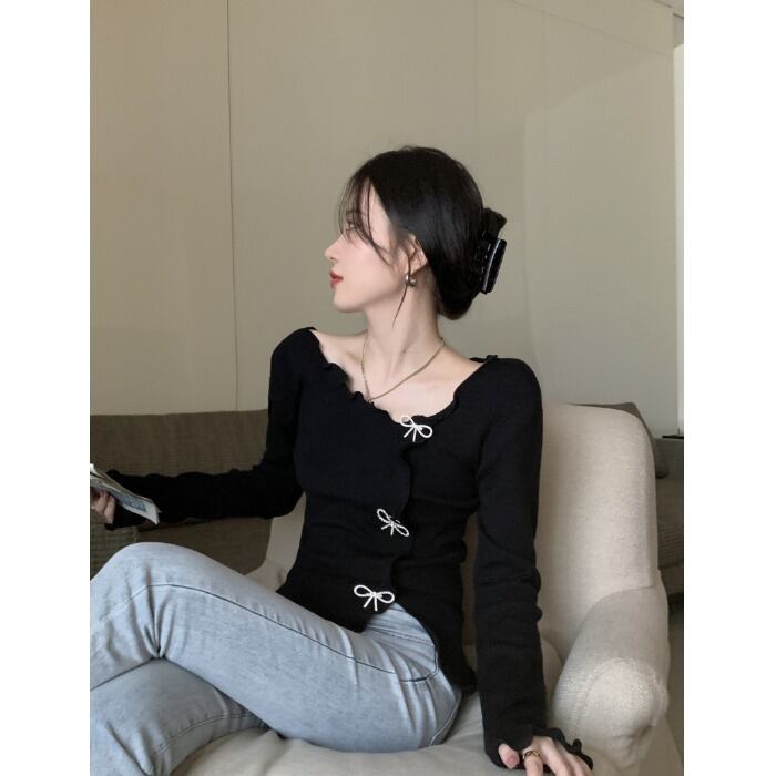 リボンブラックニットセーター オータムスリムトップス 大人ガーリー スウィート キュート カジュアル 秋物 10/5 秋冬 オータム ウインター ナチュラル mi4626809303604